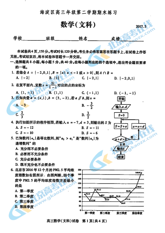 2017海淀高三二模数学(文)试卷&答案