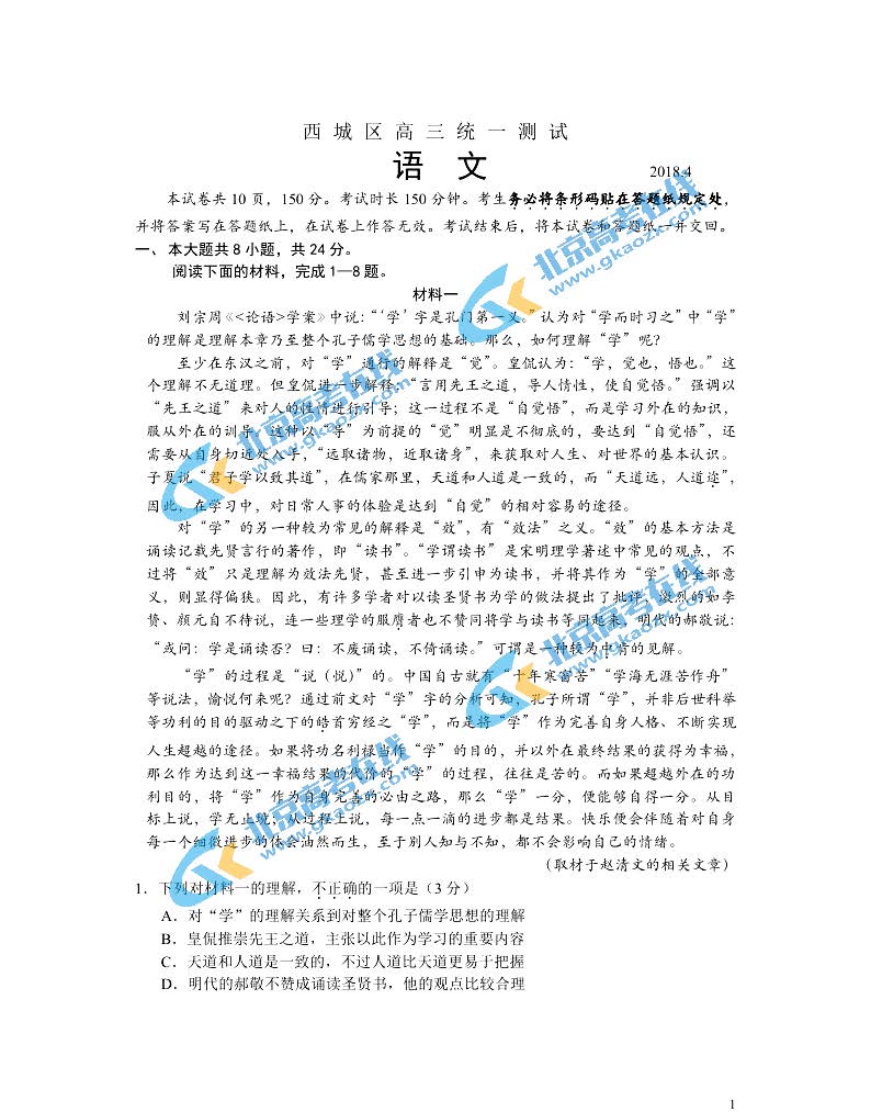 4月9日,西城区进行了高三一模考试,目前, 2018年西城高三一模语文试卷&答案已经出炉!
