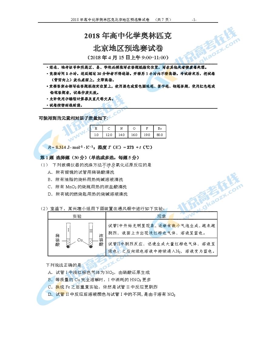 4月15日,2018年高中化学奥林匹克预选赛在北京举行!目前,北京地区预选赛试题及答案已经出炉!请及时下载查看!