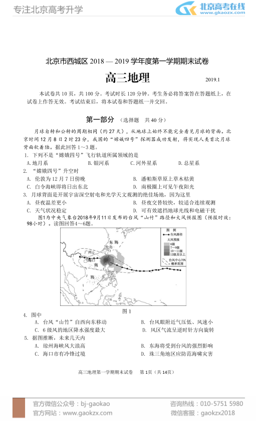 1月15日起,北京高三年级将陆续开始2019年上学期期末考试!北京高考在线网整理2019年北京西城区高三上学期期末试题及答案,供参考!- 1
