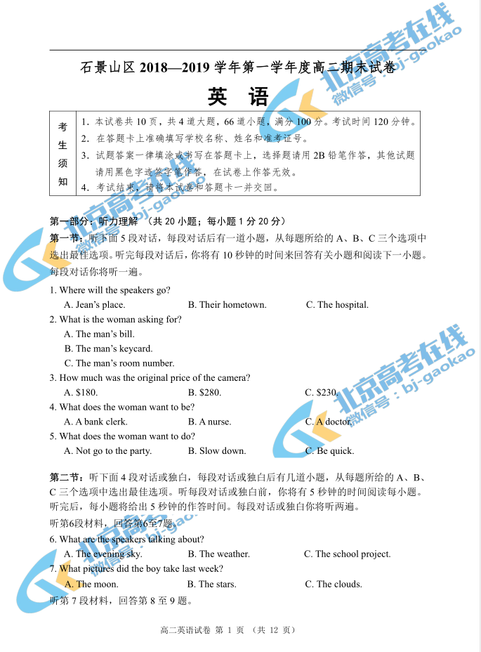 立即下载:石景山区2018-2019学年第一学期期末高二英语试题及答案