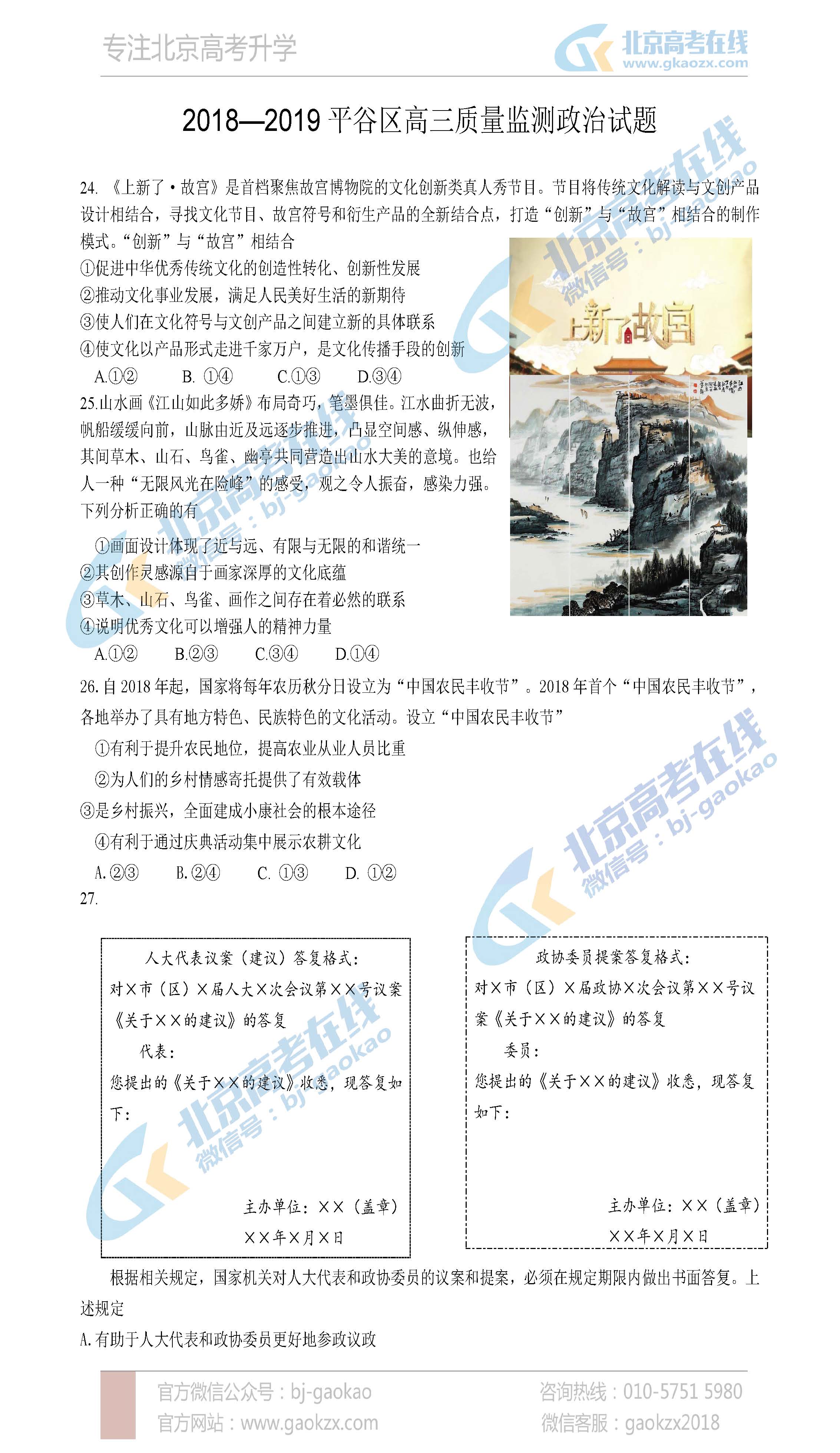 2019平谷高三一模政治试卷及答案出炉,北京高考在线整理,供参考。