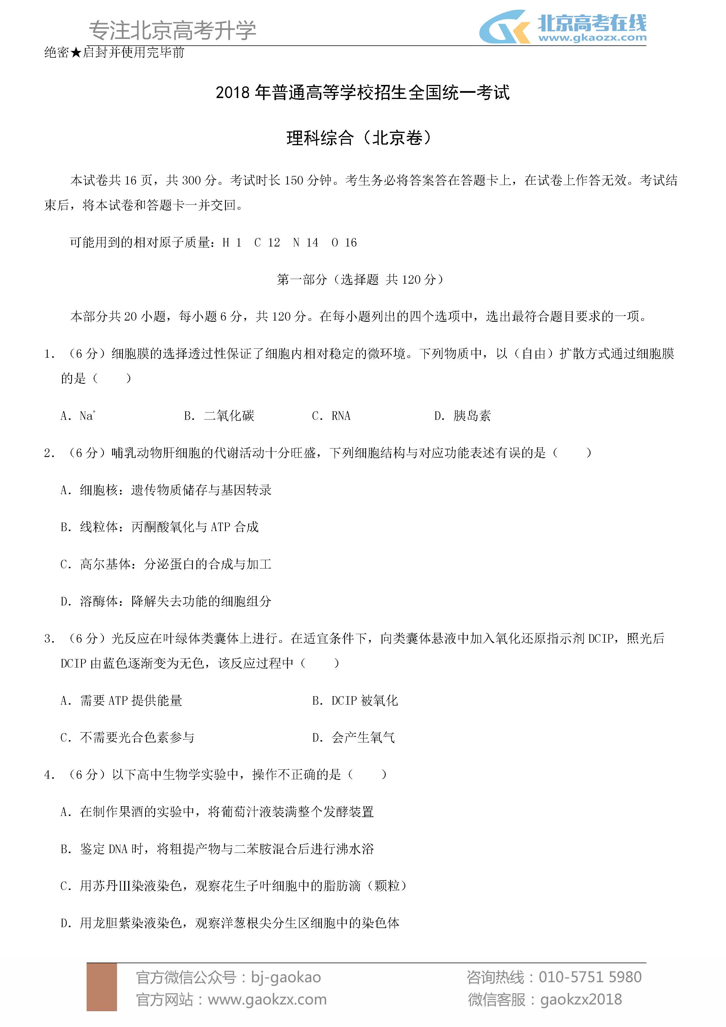 北京高考在线网整理了2018年北京市高考理综真题及答案,供考生学习参考。北京高考在线网整理了2018年北京市高考理综真题及答案,供考生学习参考。