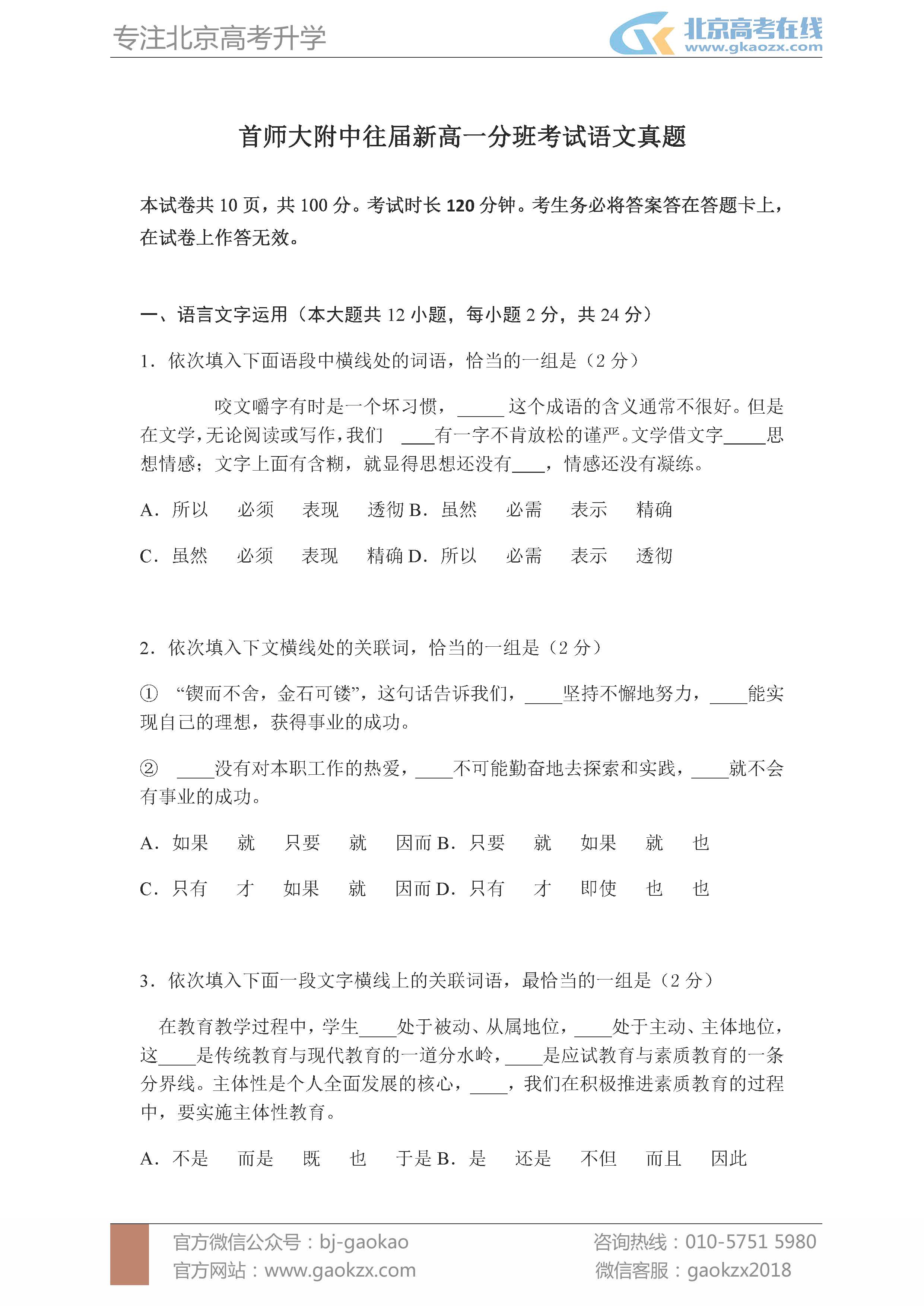 北京高考在线团队搜集整理了各中学往届新高一分班考试语文试题,以下是首都师范大学附属中学往届新高一分班考试语文试题及答案,供参考。