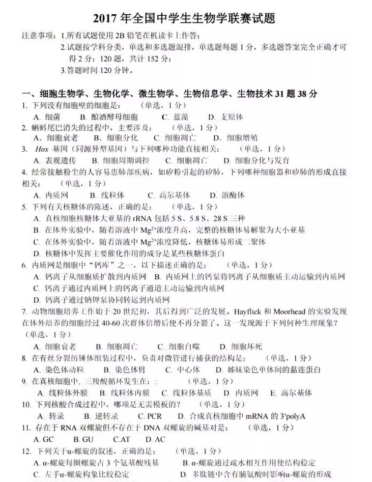 北京高考在线团队整理了2017年全国中学生生物学联赛试题及参考答案,供参考。为帮助北京考生准备2020年生物学竞赛,北京高考在线团队整理了2017-2019年生物竞赛试题,以下是2017年全国中学生生物学联赛试题及参考答案,供参考。