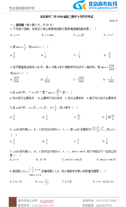 北京昌平二中2020届高三开学测试数学试题