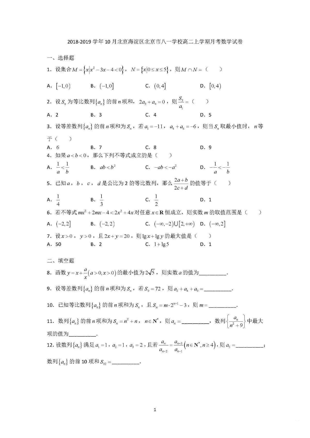 八一学校2018-2019学年高二10月月考数学试题已经发布,准备月考的考生们可下载查看了,此次只有试题没有答案。- 1