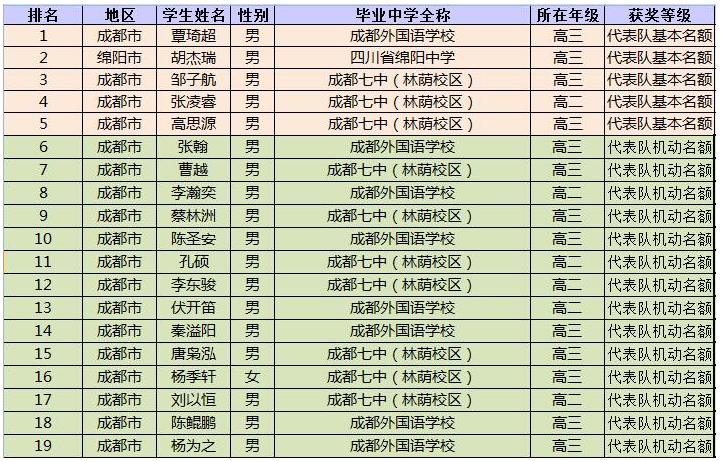四川省2019年第36届全国中学生物理竞赛省队名单