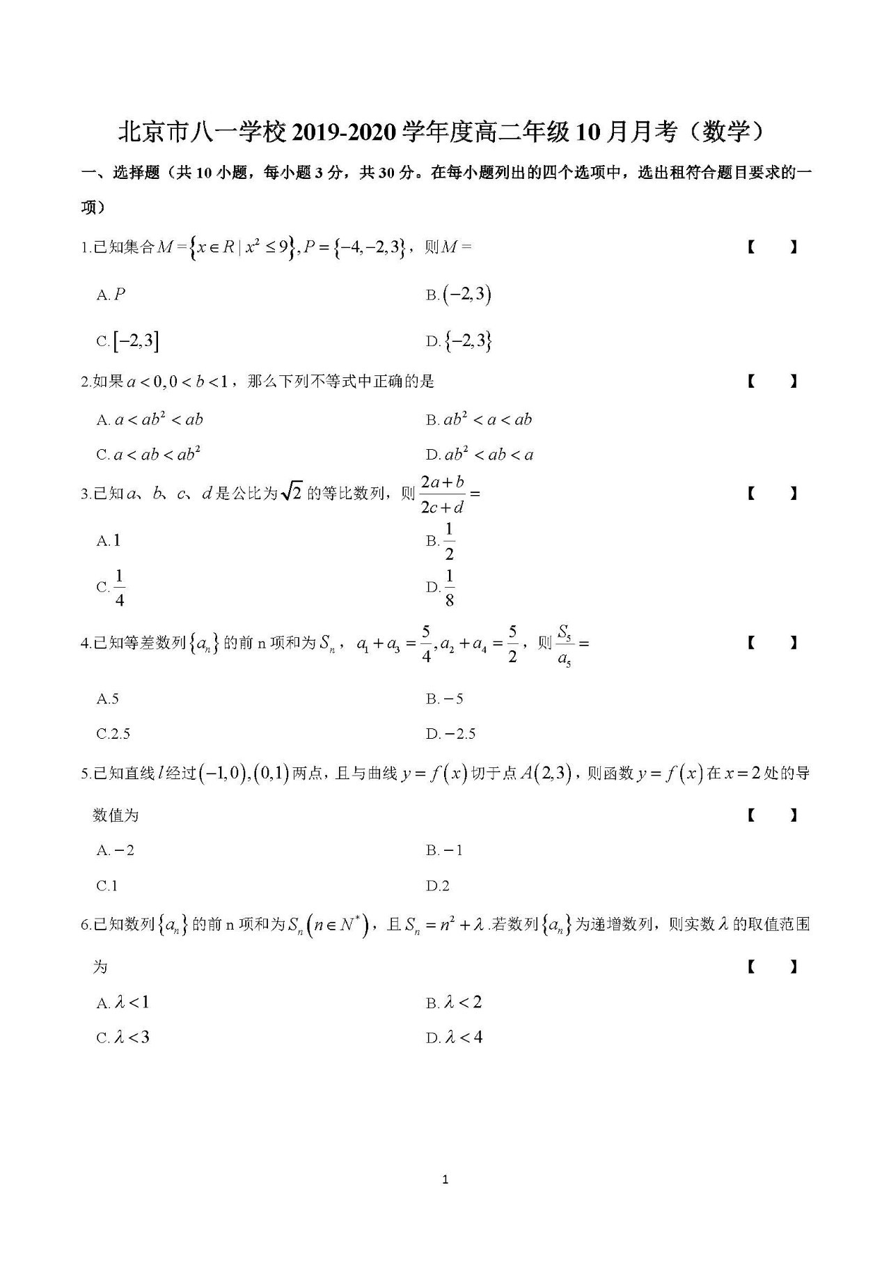 北京市八一学校2019-2020学年度高二年级10月月考数学试题发布,此次试题没有答案,需要的考生可进行下载了!- 1