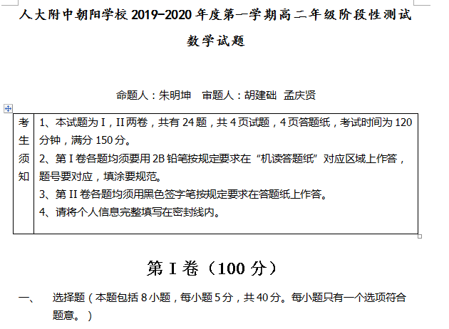 人大附中朝阳学校2019年10月高二阶段性练习数学试题发布,北京高考在线网站做了整理发布,一起来看人大附中朝阳学校近几年突飞猛进,各项成绩飞速增长,其试题也具有很高的参考性。北京高考在线网站搜集整理了人大附中朝阳学校2019年10月高二阶段性练习数学试题,,供各位考生参考!