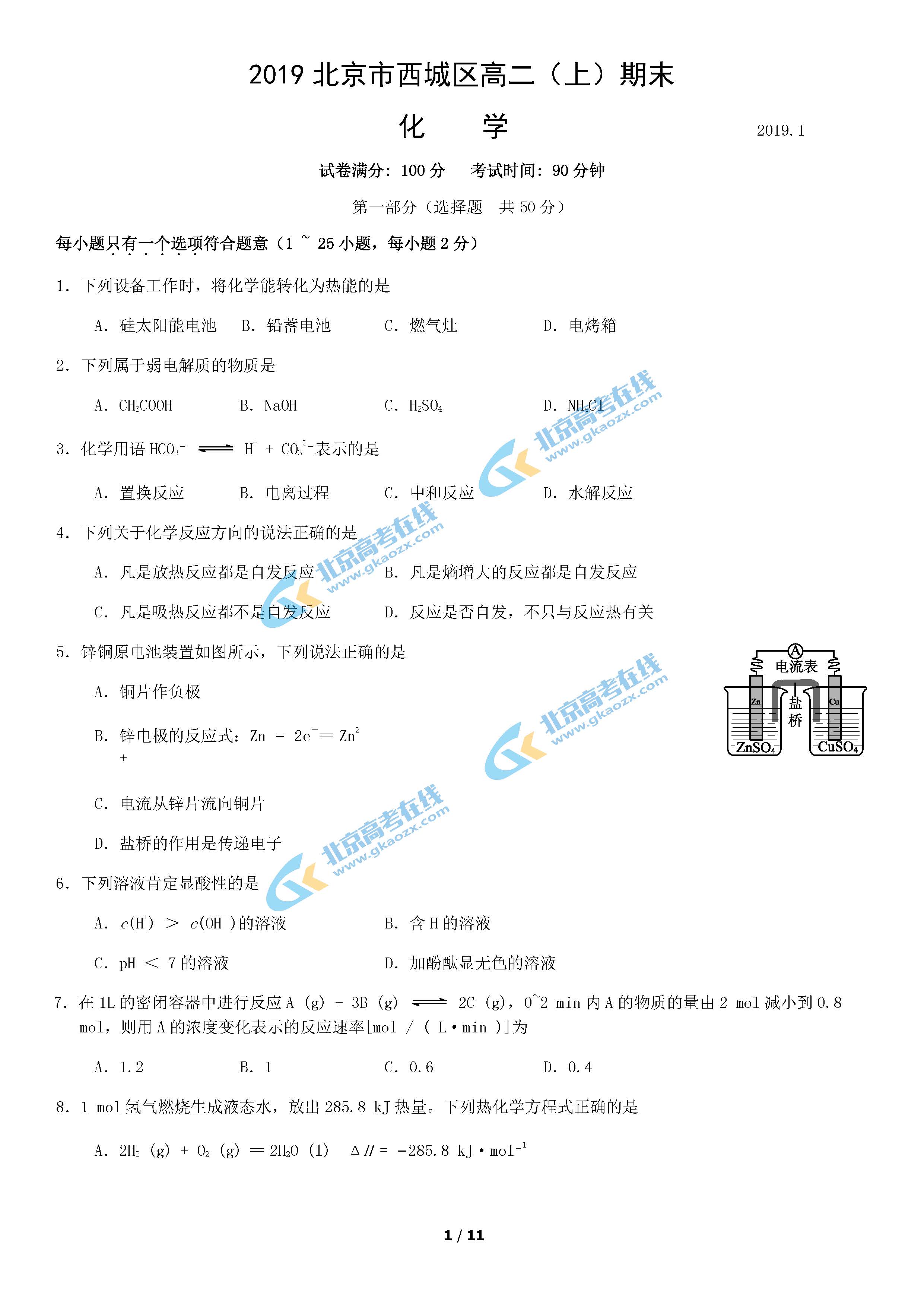 西城区2020年期末考试将于1月8日-10日进行,为方便各位考生在考试前查漏补缺,特此整理了2019年北京市西城区高二期末试题!供各位考生参考练习!以下北京高考在线团队整理了2019年西城区高二上学期期末化学试题答案!