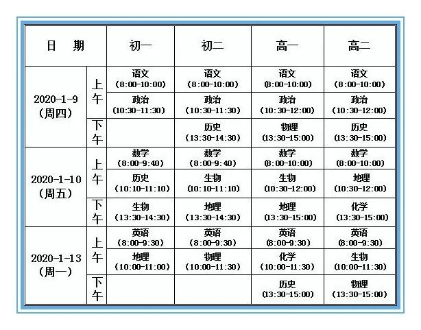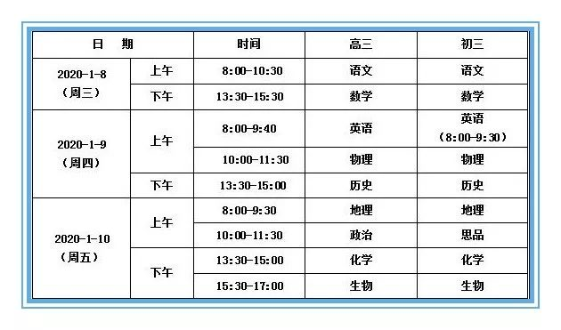 北京高中2020年上学期期末考试安排2020-01-06