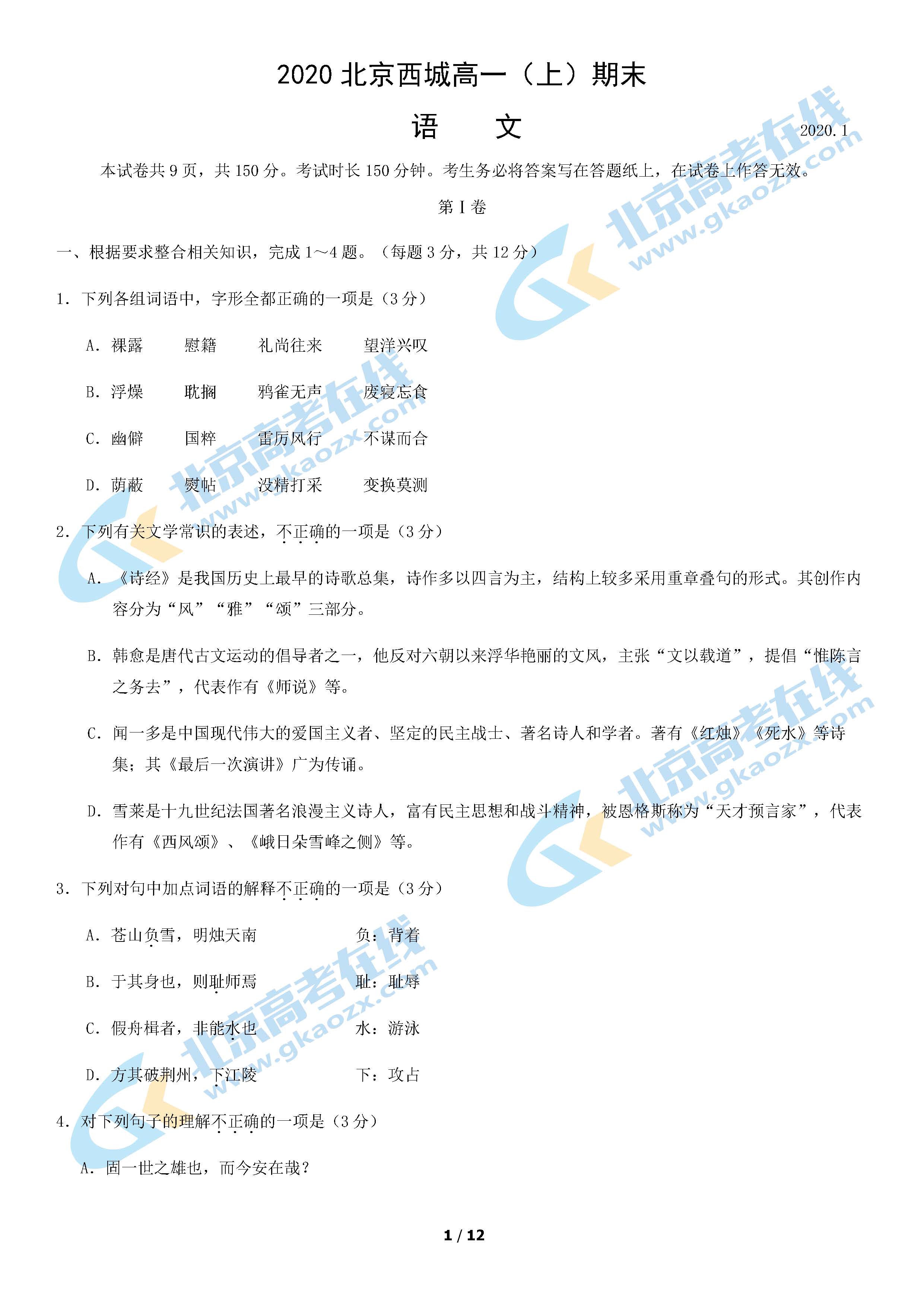 立即下载:西城区2019-2020学年上学期高一期末考试语文试题及答案