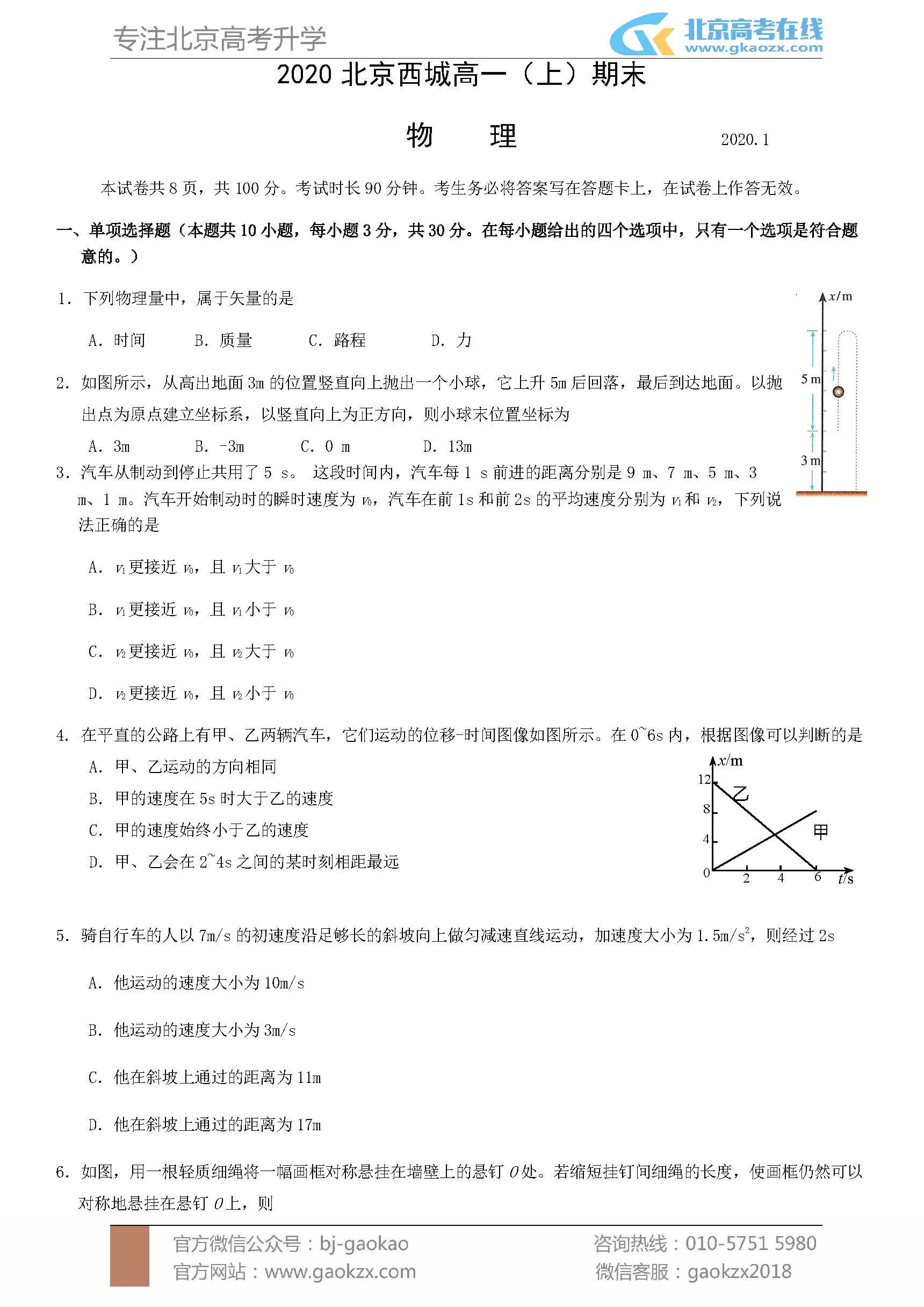西城区2020年1月高一期末考试物理试题及答案发布,你对答案了吗?一起来看看正确率有多少?1月9日,北京西城区高一考生期末考试正在进行,今天考试科目为物理及政治,目前物理考试已经结束,答案出炉。北京高考在线团队整理了此次西城高一期末物理答案,供北京考生下载查看。