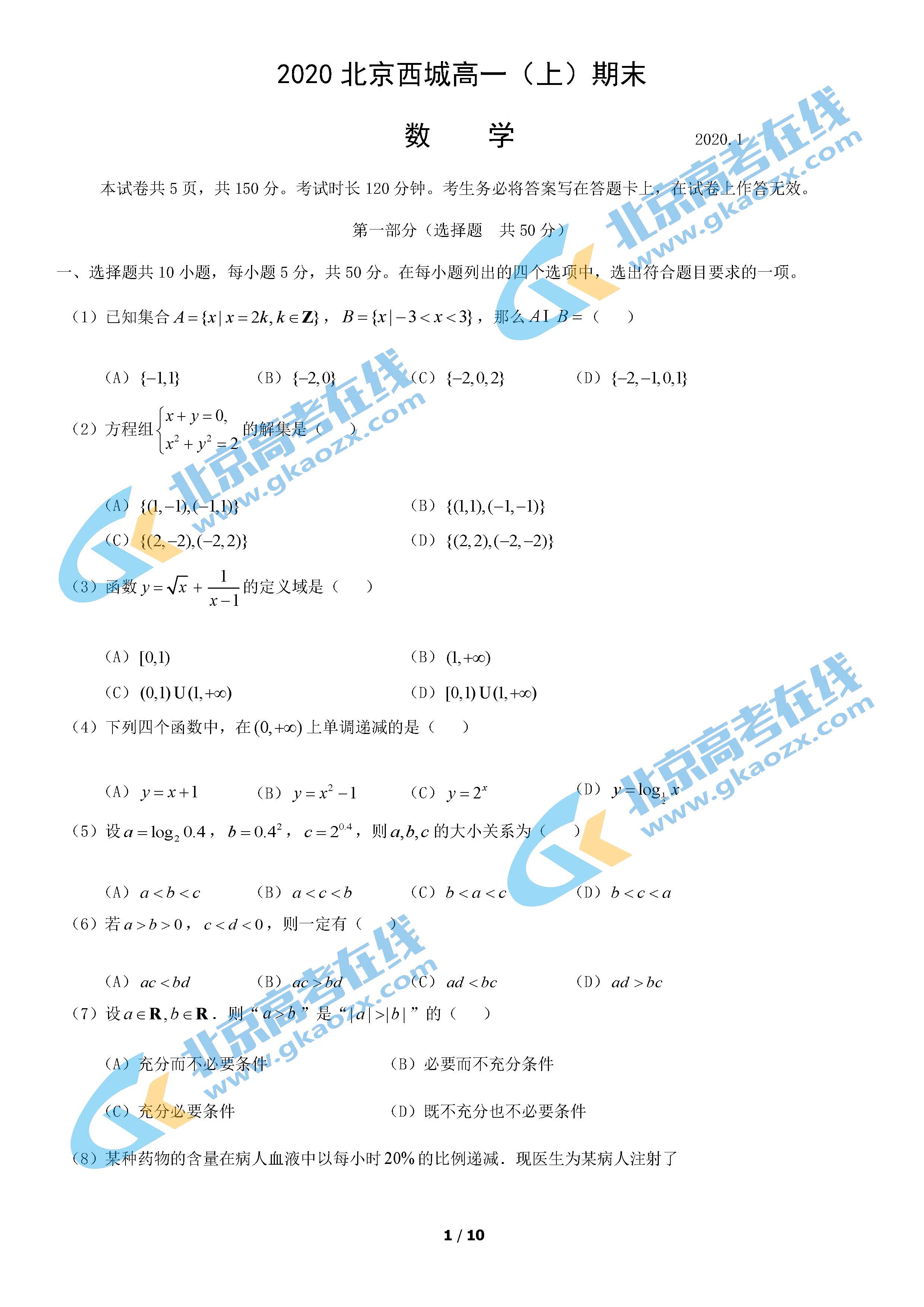 西城区高一期末考试在1月8日进行,目前部分试题答案出炉!北京高考在线团队整理西城区高一年级数学试题答案,供各位考生下载练习!