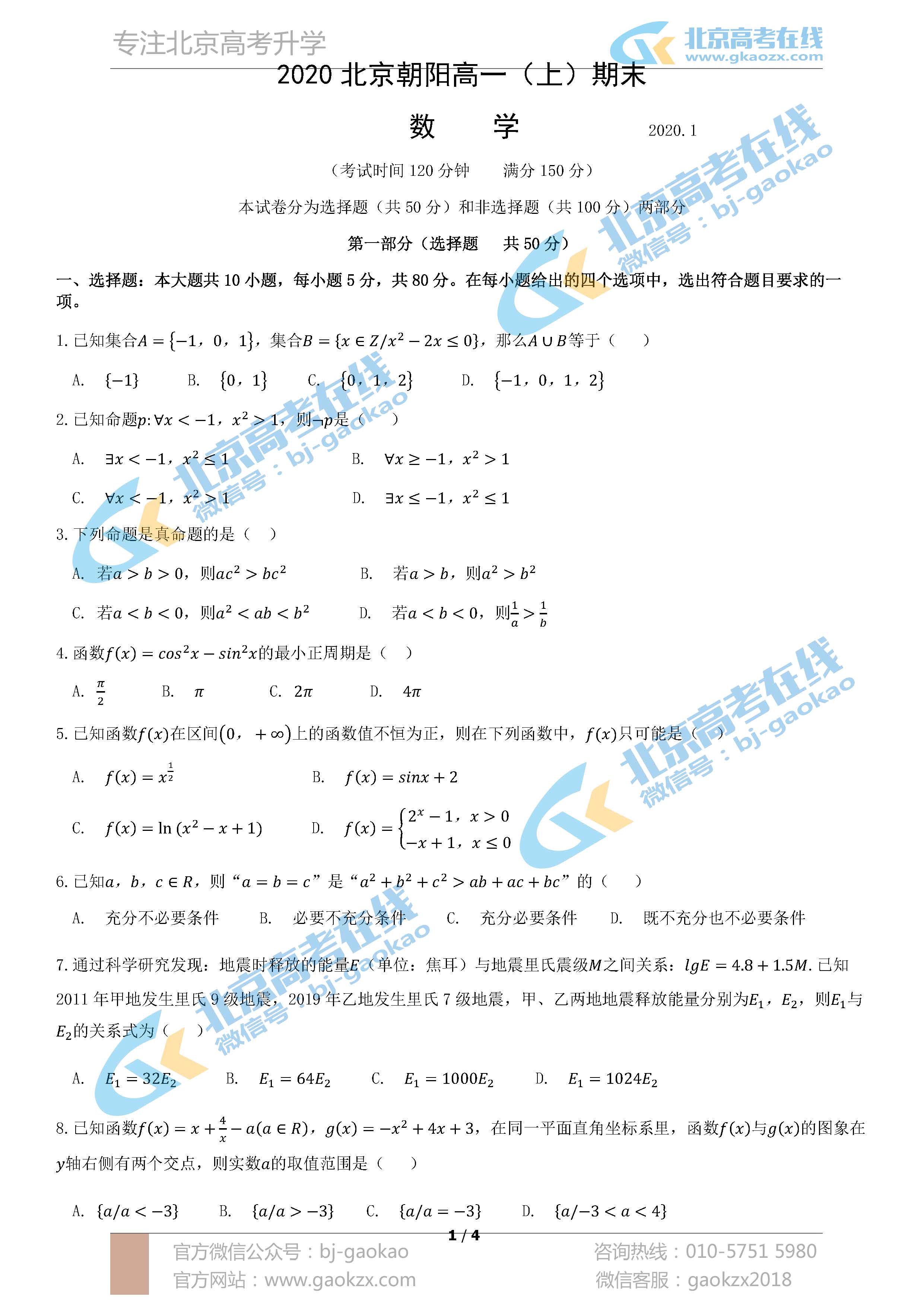 说明:附件仅为朝阳高一数学试题,答案请点击第5页查看。