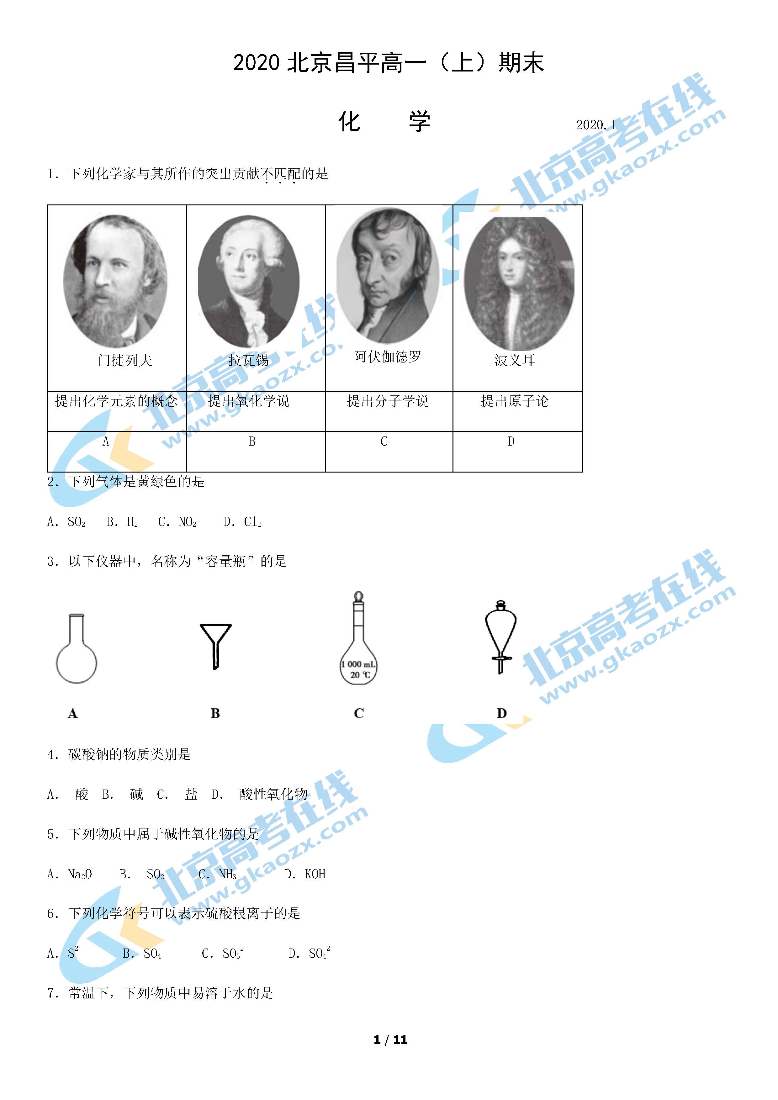 昌平区高一上学期期末考试正在进行,化学科目考试已经结束。北京高考在线团队收集了高一期末化学试题及答案,供参考。2020年1月,昌平高一年级期末考试开考,这是本学期最重要的一次测试。为帮助北京考生复习参考此次昌平高一期末试题,北京高考在线团队收集了高一期末化学试题及答案,供北京考生参考。