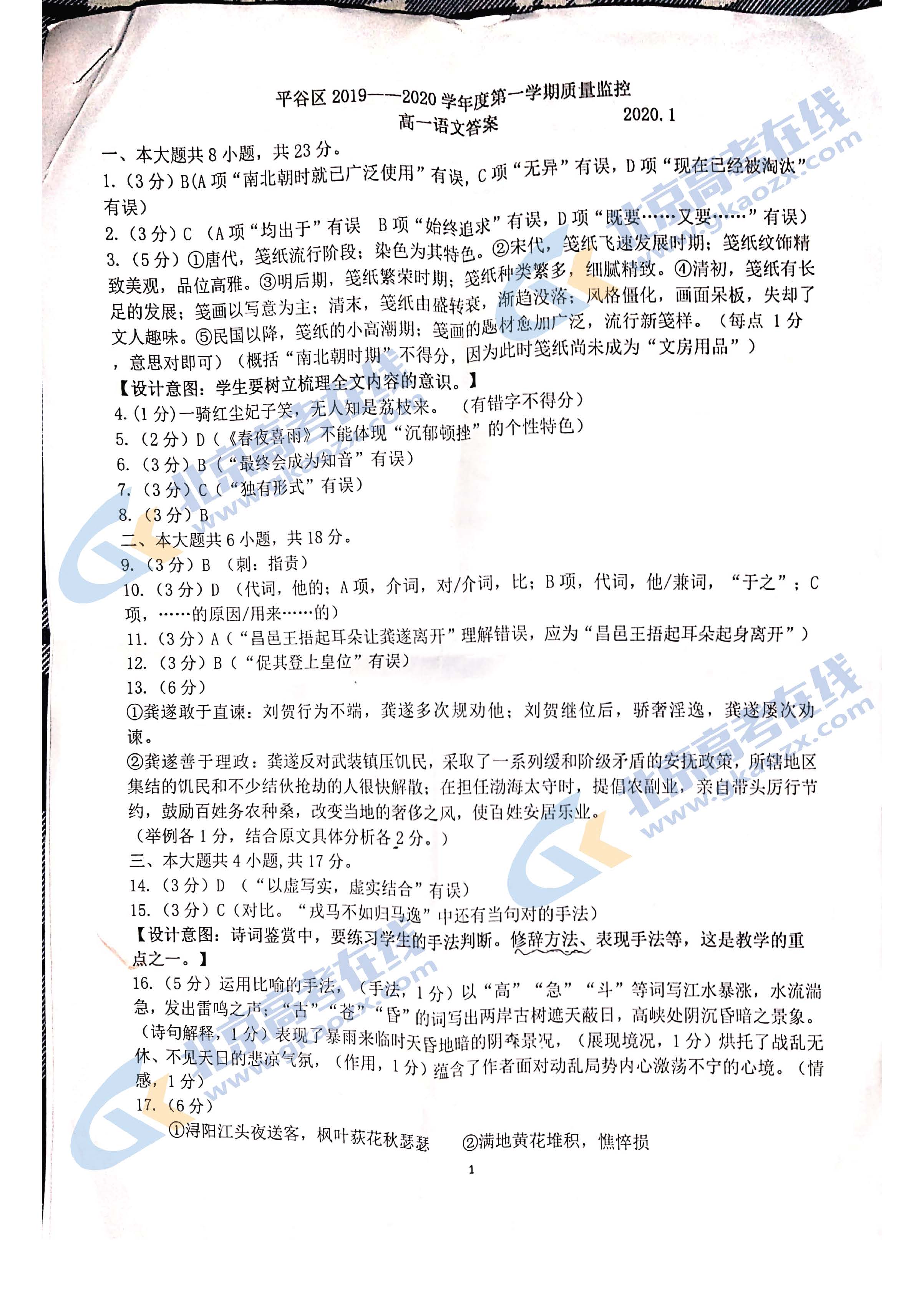 1月9日,平谷区高一年级进行了期末考试。目前,语文试卷及答案已经发布,北京高考在线网站进行了搜集整理,一起来看看吧!