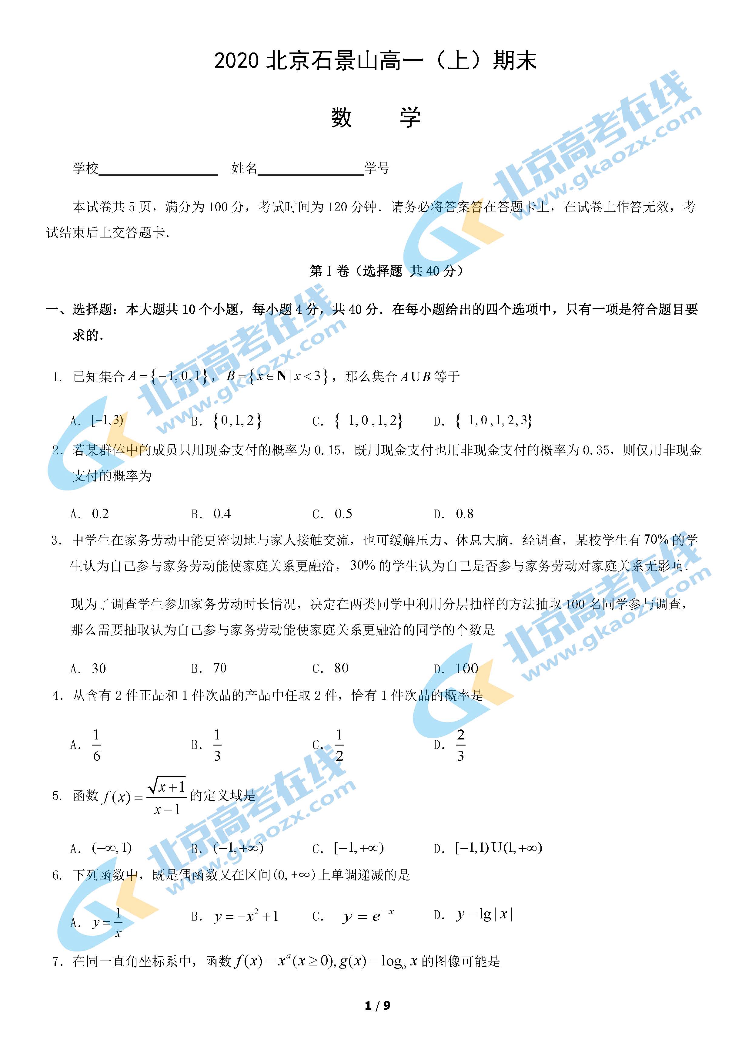 1月上旬,北京石景山区高一考生进行期末考试。为帮助北京考生复习参考石景山高一期末试题,北京高考在线团队进行了收集整理。以下是石景山2020年高一上学期期末数学试题及答案,供参考。