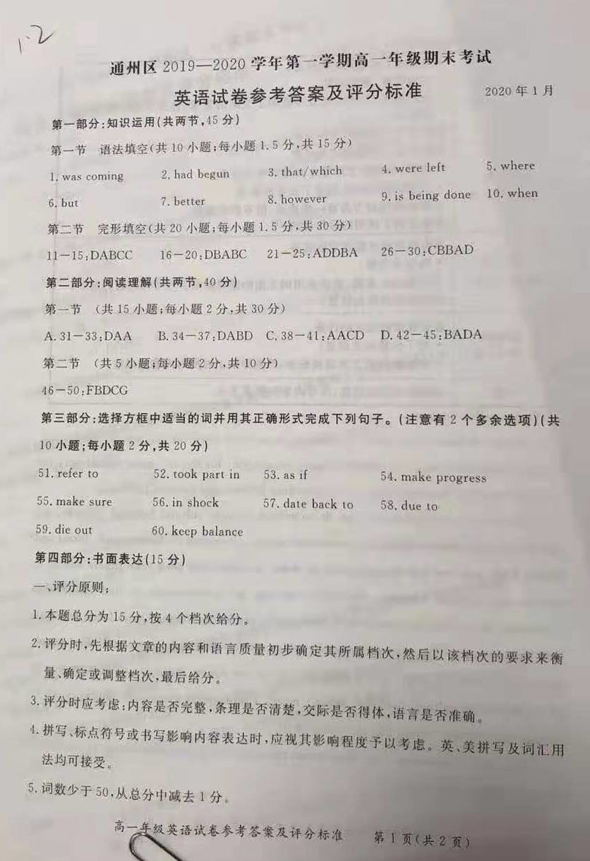 通州2019-2020年度第一学期高一年级期末考试刚刚落下帷幕,目前英语科目试题答案已经出炉!北京高考在线团队整理英语试卷参考答案,供各位考生参考!