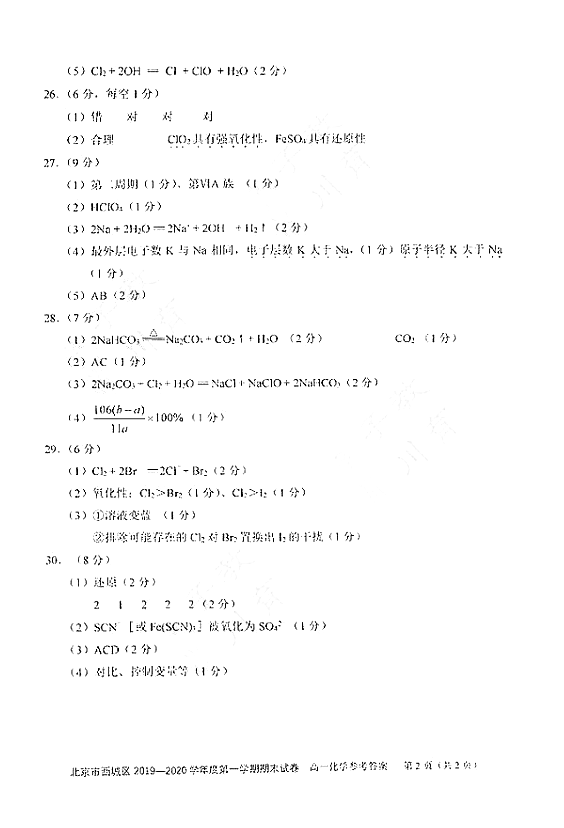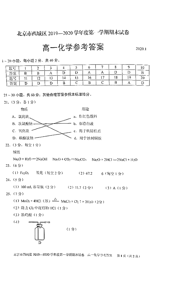 昌平区2020年高一期末考试化学试题及答案(上学期)2020-01-10
