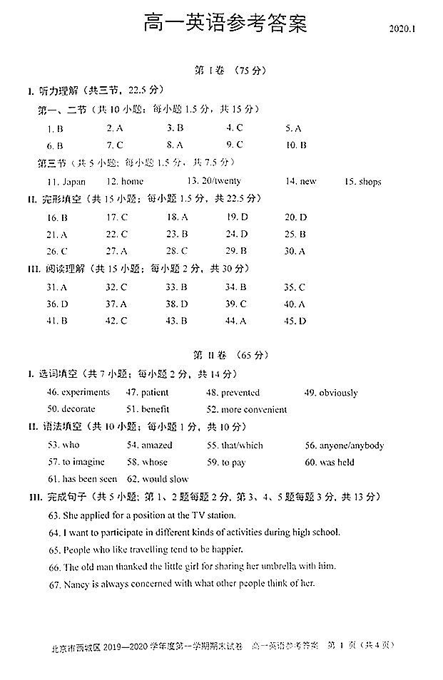 西城区2020年1月高一期末考试英语试题及答案出炉,北京高考在线团队收集整理,供参考。1月上旬,北京西城区高一考生进行本学期期末考试,目前各科考试已经结束,试题及答案陆续出炉。北京高考在线团队整理了此次西城高一期末英语试题及答案,供北京考生下载查看。