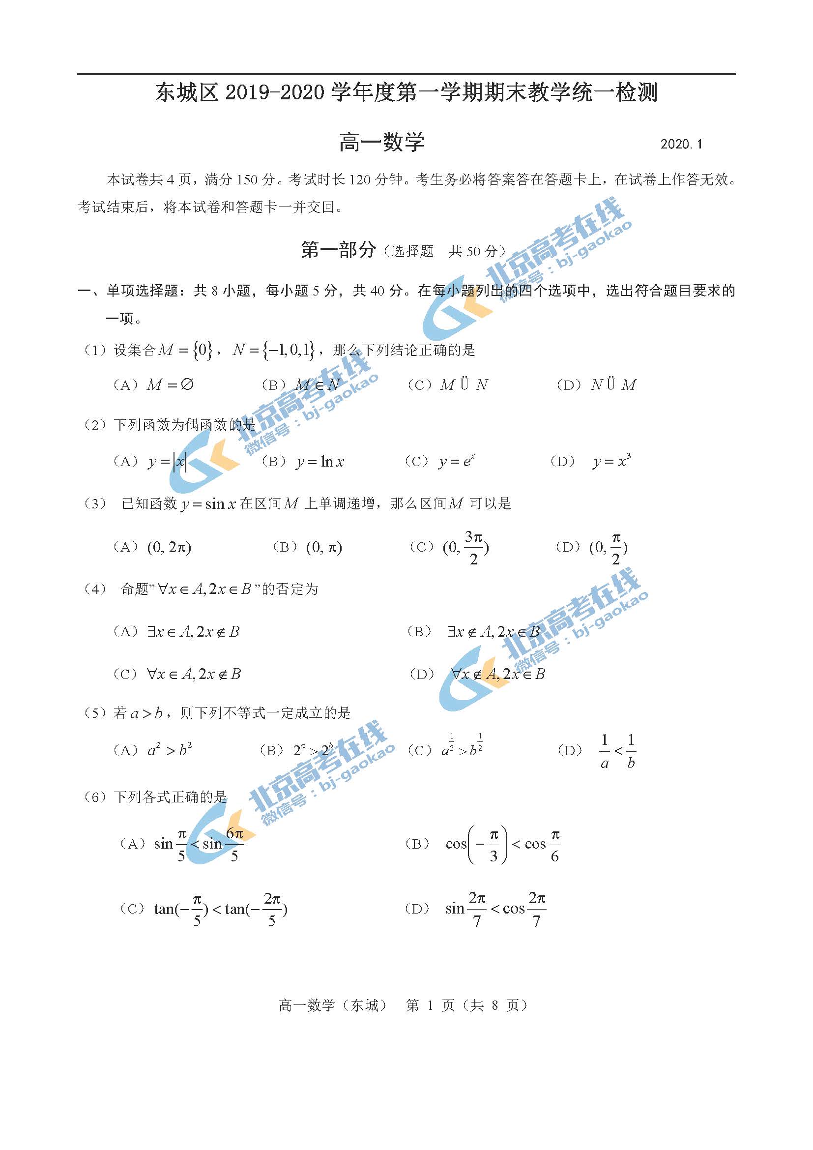 2020年1月上旬,北京东城区高一考生进行了本学期期末考试,目前考试已经结束,各科期末试题陆续公布。本文整理了东城区2020年高一期末数学试题及答案,供各位考生下载查看。