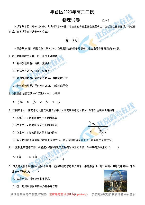 受疫情影响,北京2020年高考延期一个月进行,各类考试也相对往年有所延期。近期,北京各区高三考生二模考试陆续开考。为帮助考生参考2020年高三二模试题,北京高考在线团队进行了收集,本文就来分享丰台高三二模物理试题及答案。