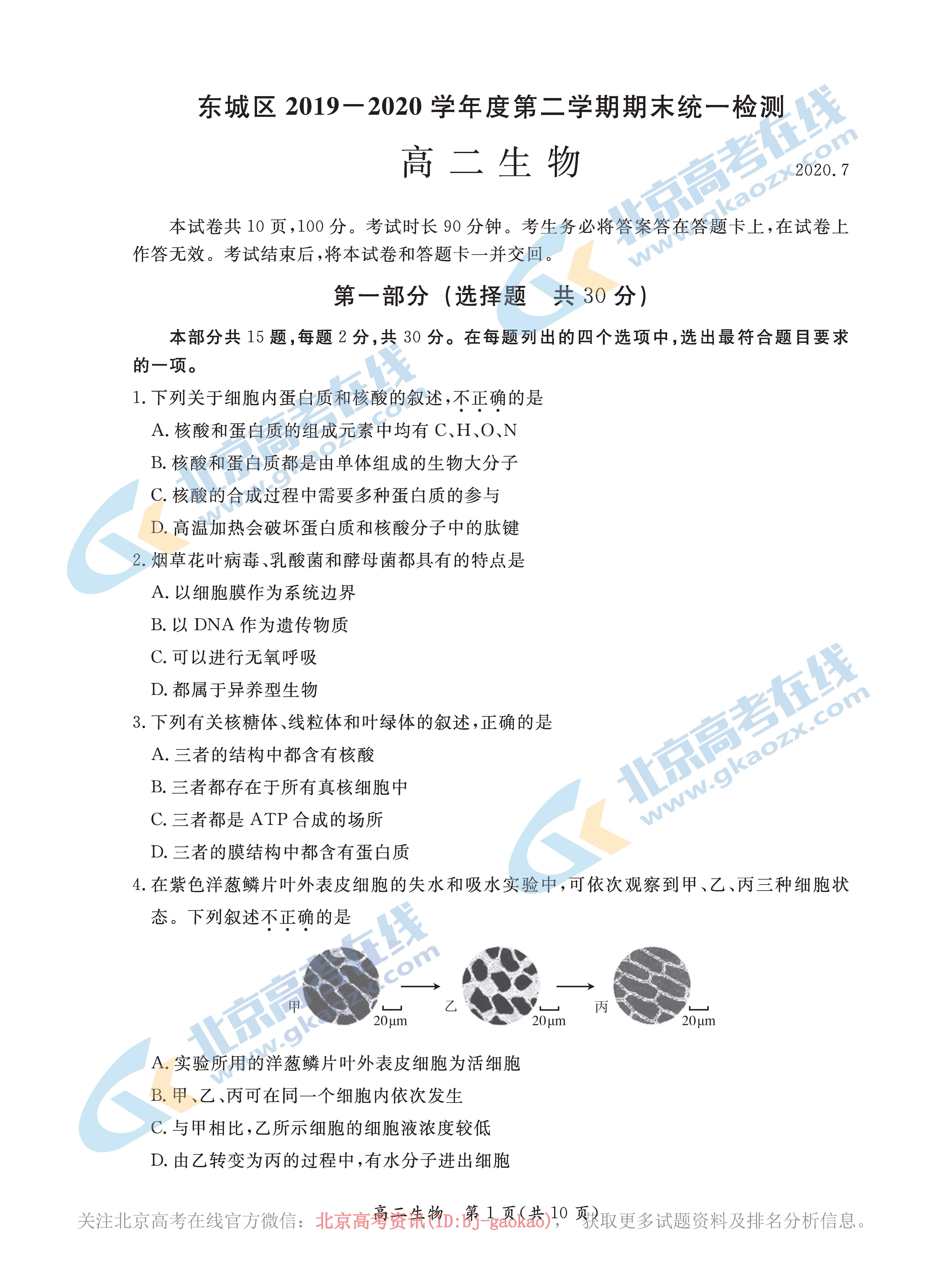 北京高考在线网站进行了搜集整理,一起来看看东城区2019—2020学年第二学期期末高二生物试题。北京高二期末测试已经在7月份正式结束了,这次又考察了哪些知识点呢?北京高考在线网站进行了搜集整理,一起来看看东城区2019—2020学年第二学期期末高二生物试题。