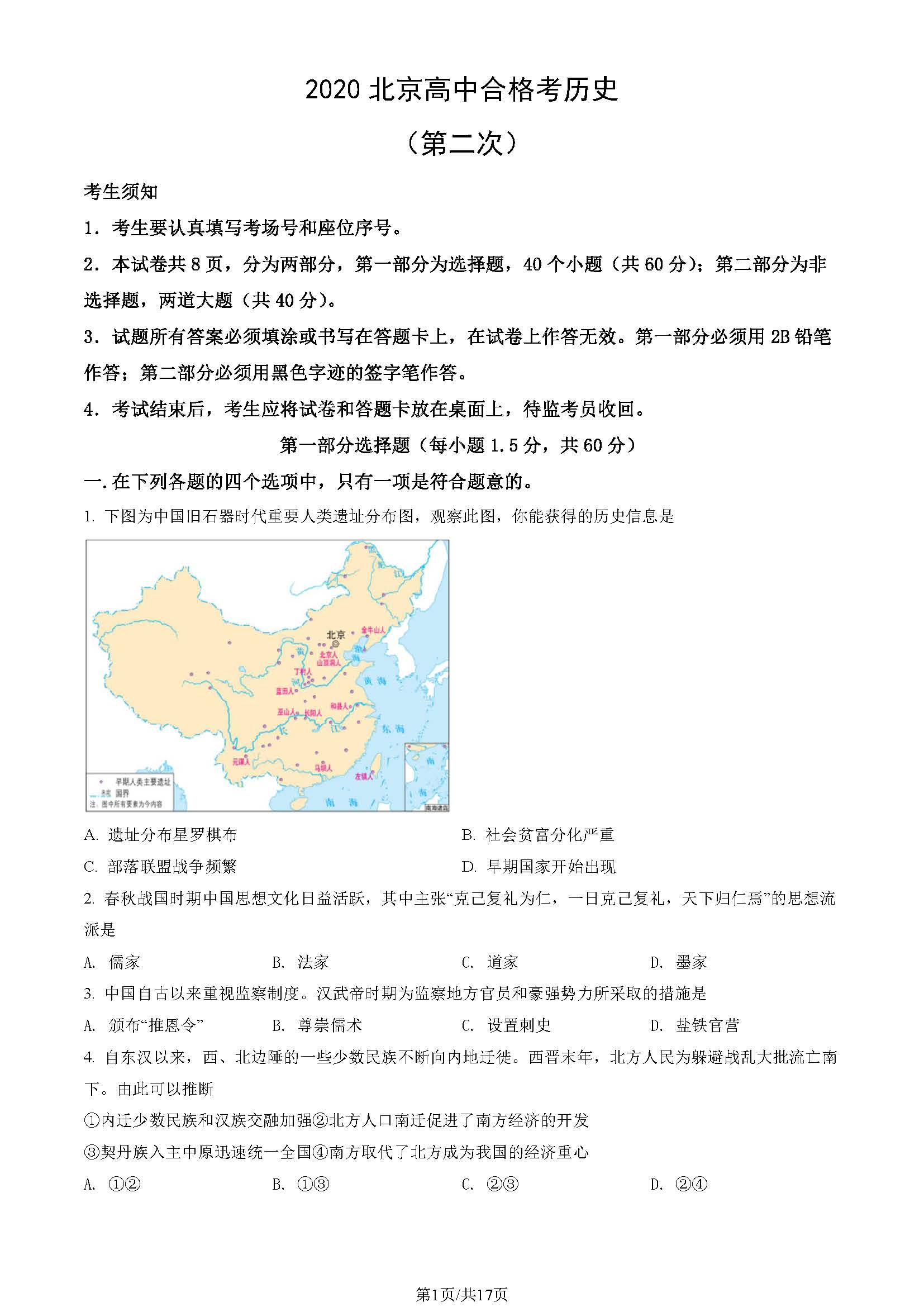 9月23日至25日,2020年北京市第二次高中学业水平合格性考试举行。目前,此次合格考试题和答案正在陆续公布中,北京高考在线团队整理历史科目试题,供各位考生下载练习!