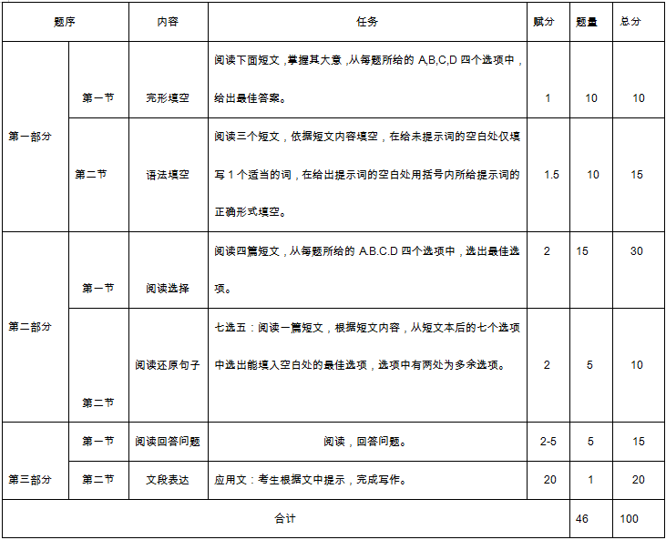笔试部分满分100分,考试时间调整为90分钟。试卷整体由知识运用(25分)、阅读理解(40分)和书面表达(35分)构成。具体包括完形填空(10分)、语法填空(15分)、阅读理解(40分)、阅读表达(15分)和作文(20分)。其中作文部分保留了应用文,分值调整为20分,去掉了原来的看图作文。(笔试部分结构见下表)
