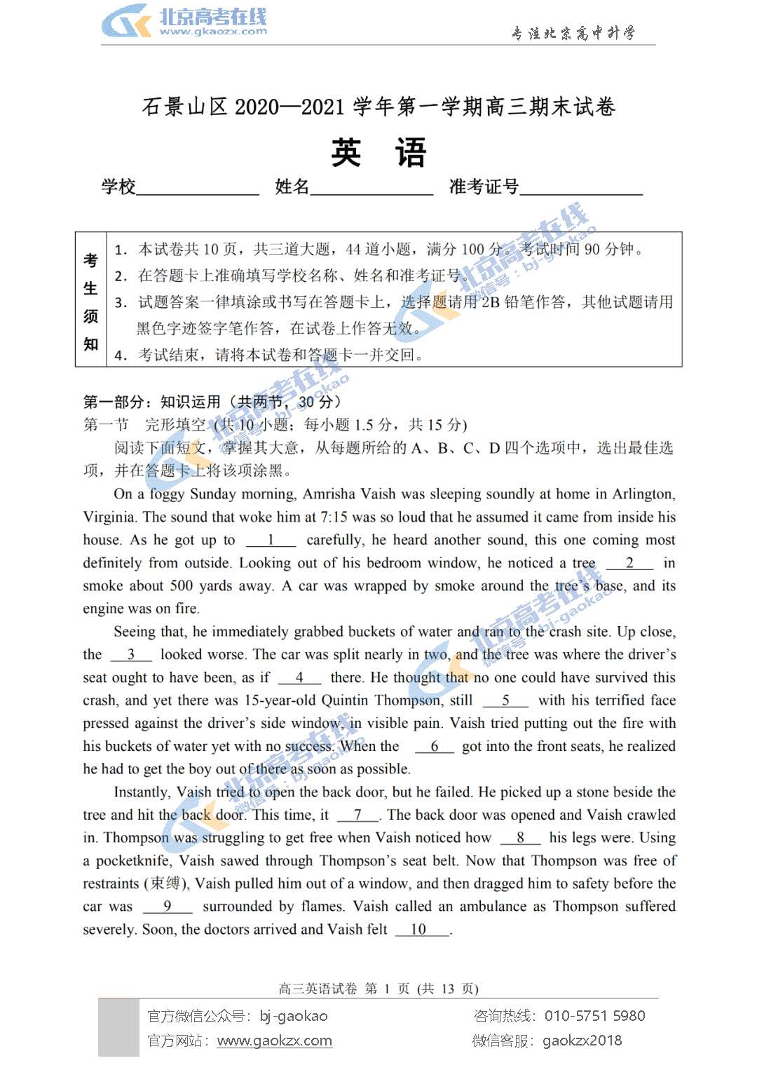 2021年北京石景山区高三期末英语考试已结束,北京高考在线整理了石景山区高三期末考试英语试题及答案,供各位考生参考。北京石景山区高三期末英语科目考试已结束。北京高考在线团队整理了石景山区高三期末考试英语科目试题及答案,供各位考生下载练习!