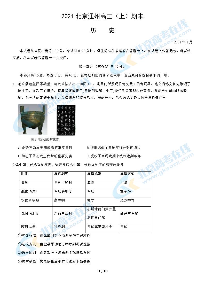 2021年1月26日,北京通州区高三期末考试历史科目考试已经考试完毕。历史考试试题和答案已经公布,北京高考在线团队整理历史科目试题答案,供各位考生下载练习!