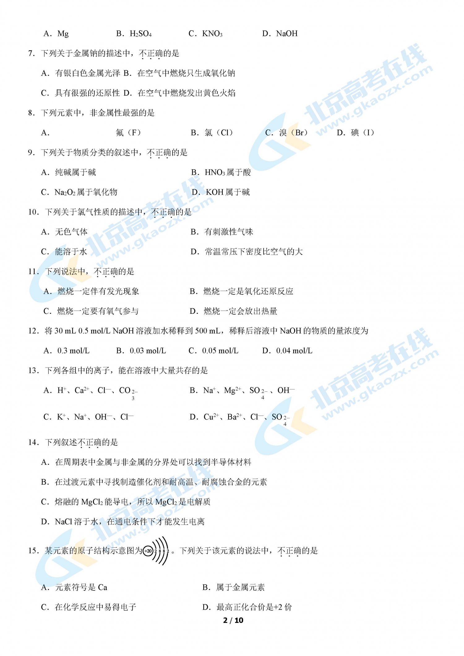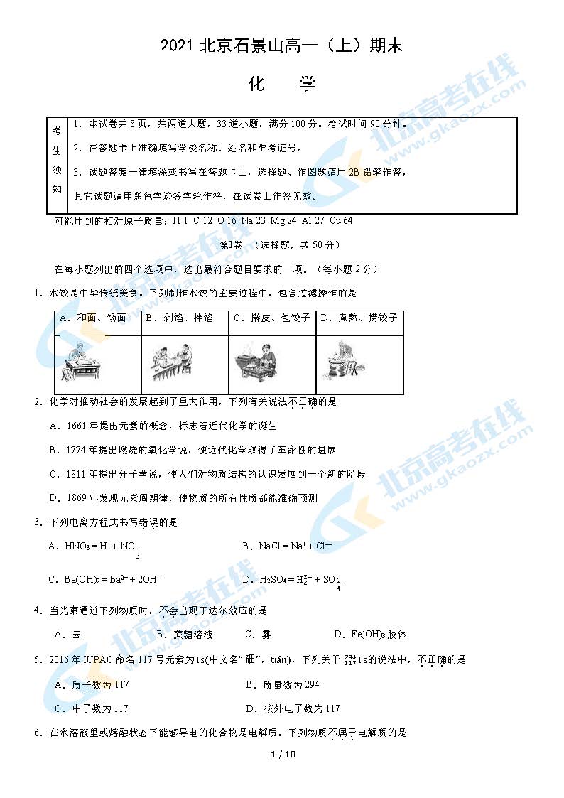 2021年1月,北京石景山区高一期末考试化学科目考试已经考试完毕。化学考试试题和答案已经公布,北京高考在线团队整理化学科目试题答案,供各位考生下载练习!