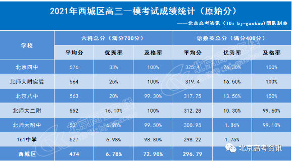 从表格数据看到,本次高三一模考试,西城区总分平均分为474分,及格率72.90%。从考试平均分来看,北京四中成绩较好,总分平均分576分,及格率100%。