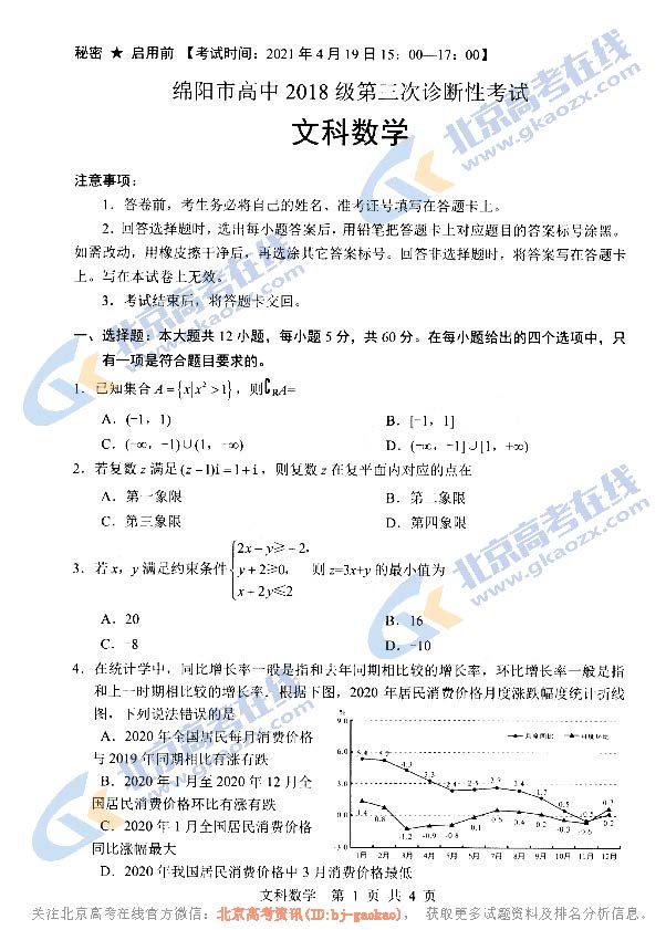 2021年绵阳市高三第三次诊断性测试4月19日-20举行,北京高考在线团队整理了绵阳三诊文科数学试题及答案,供考生学习参考。4月19日,绵阳市高三第三次诊断性测试正式开考,目前语文和数学试题及答案已经公布。北京高考在线团队整理了绵阳三诊文科数学试题及答案,分享给考生下载练习。