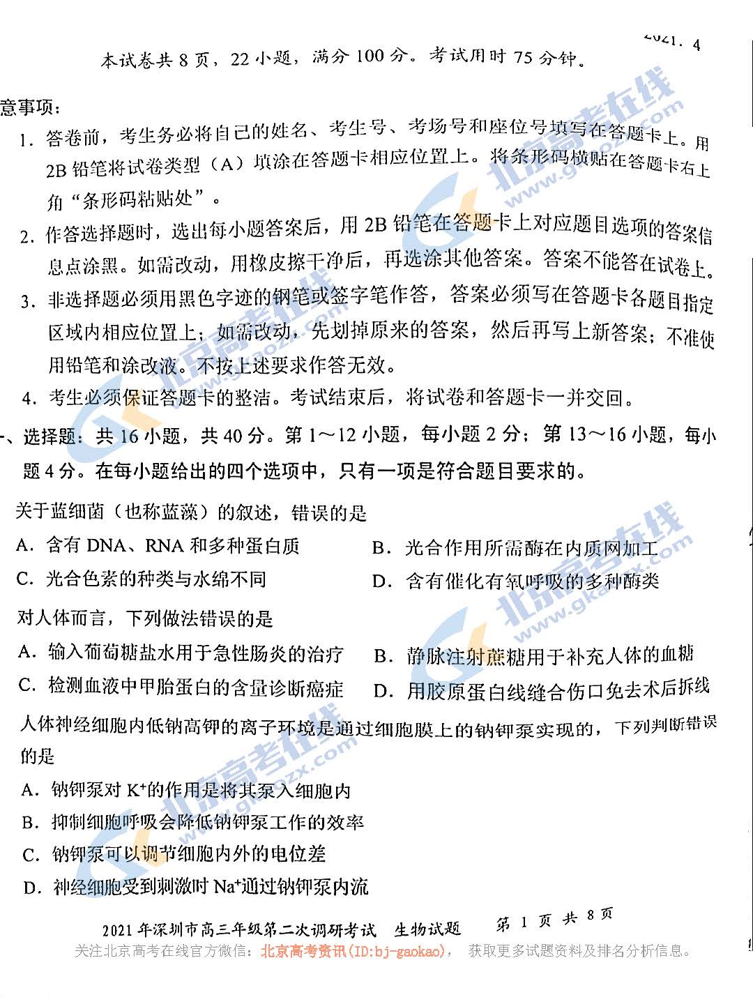 4月21日,深圳市高三二模考试开考,北京高考在线网站搜集整理了2021年4月深圳高三二模生物考试题及答案,考生及家长可收藏本页面随时查看并下载。