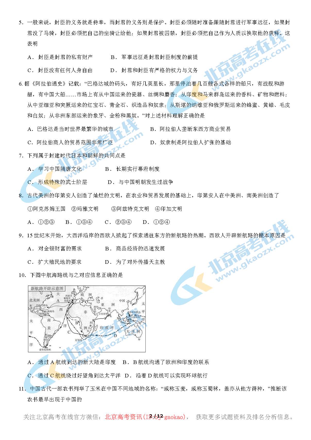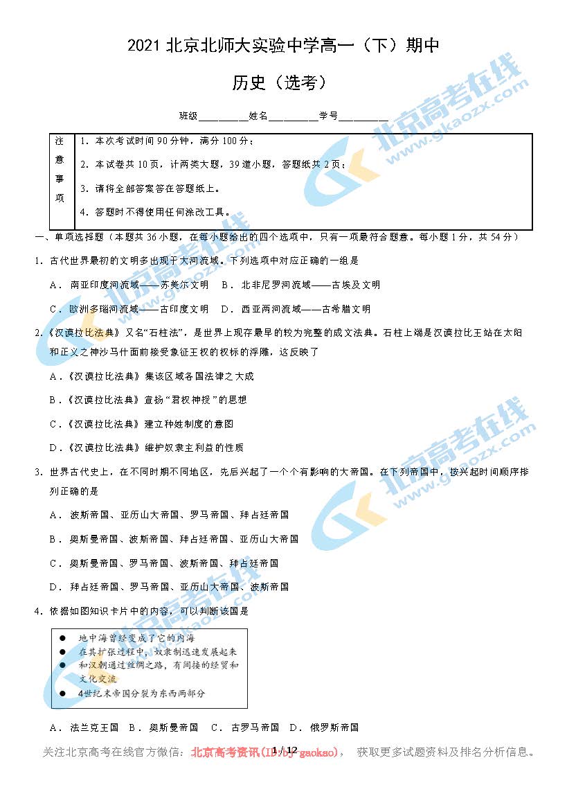 北师大实验中学2021年高一年级考生第二学期期中考试已结束,目前各科试题已陆续公布。北京高考在线团队整理了此次期中考试的历史试题及相关答案,分享给各位考生下载参考。