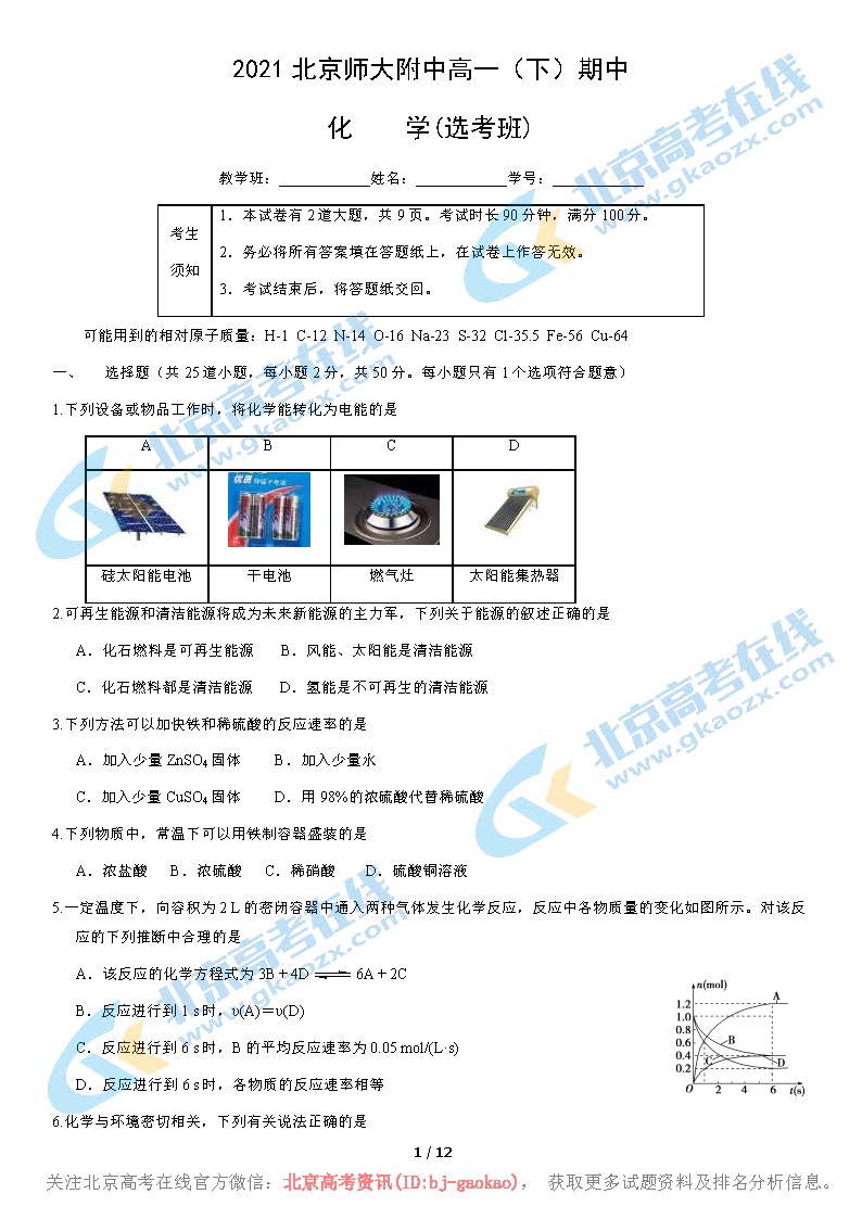 日前,北京各区高一高二年级组织了2020-2021学年第二学期期中考试,目前考试已经结束。北京高考在线团队整理了北师大附中高一期中化学试题及答案,供考生学习参考。