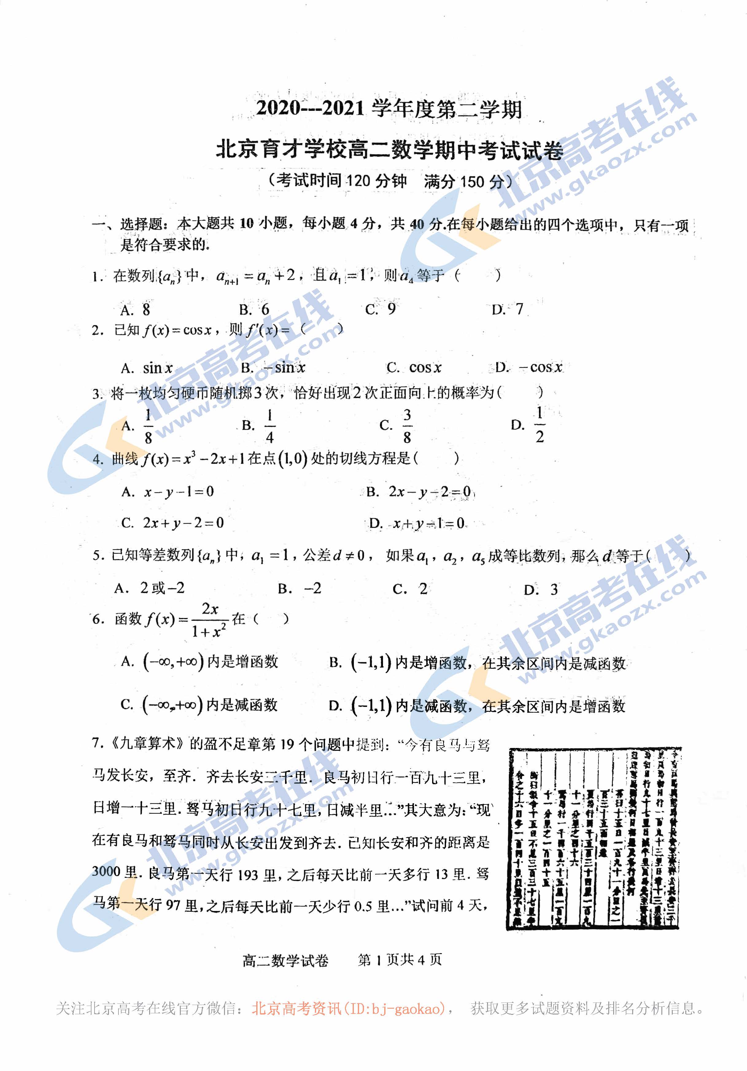 北京市育才中学2021年高二年级考生第二学期期中考试已结束,北京高考在线团队整理了此次期中考试的数学试题及相关答案,分享给各位考生下载参考。
