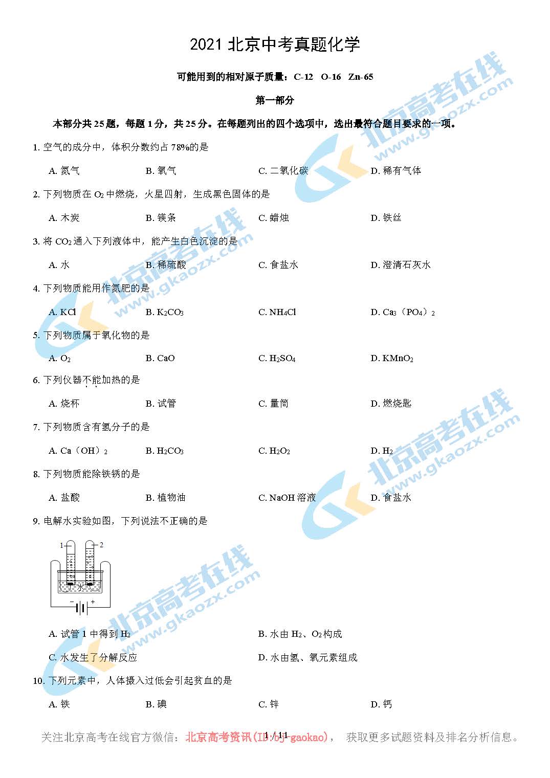 2021年北京中考于6月24日正式开考,目前各科考试已经结束。北京高考在线第一时间整理了2021年北京中考化学试题及答案,供各位考生参考。