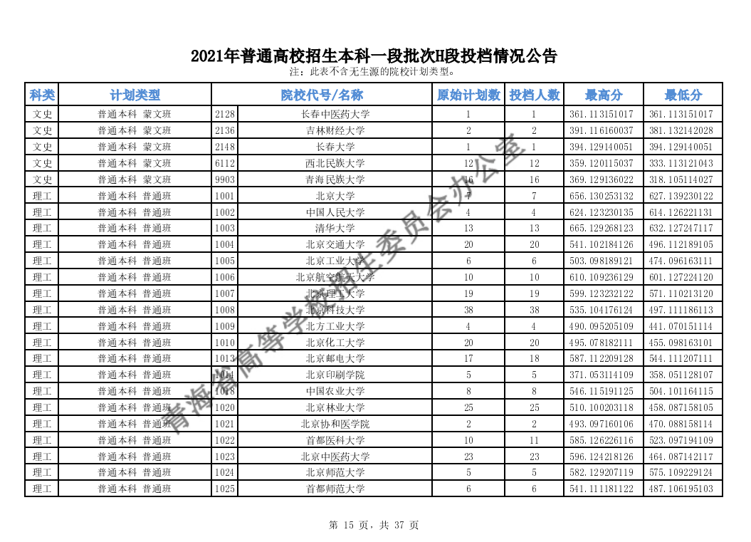 7月22日,青海省2021年普通高校招生本科一段批次H段投档分数线已经正式发布,北京高考在线团队同步更新青海省2021年高考本科一批投档分数线(理科),详情如下: