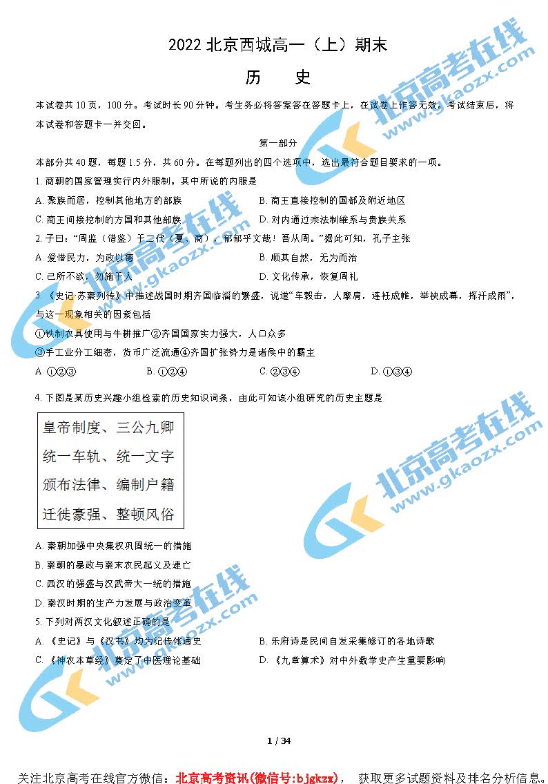 北京高考在线网站整理了西城区2022年高一上学期期末历史试题及答案,分享给各位考生下载练习。北京西城区2022年高一上学期期末考试于1月12日开考,目前考试已全部结束。北京高考在线团队整理了北京西城区2022年高一上学期期末历史试题及答案,分享给同学们下载学习。
