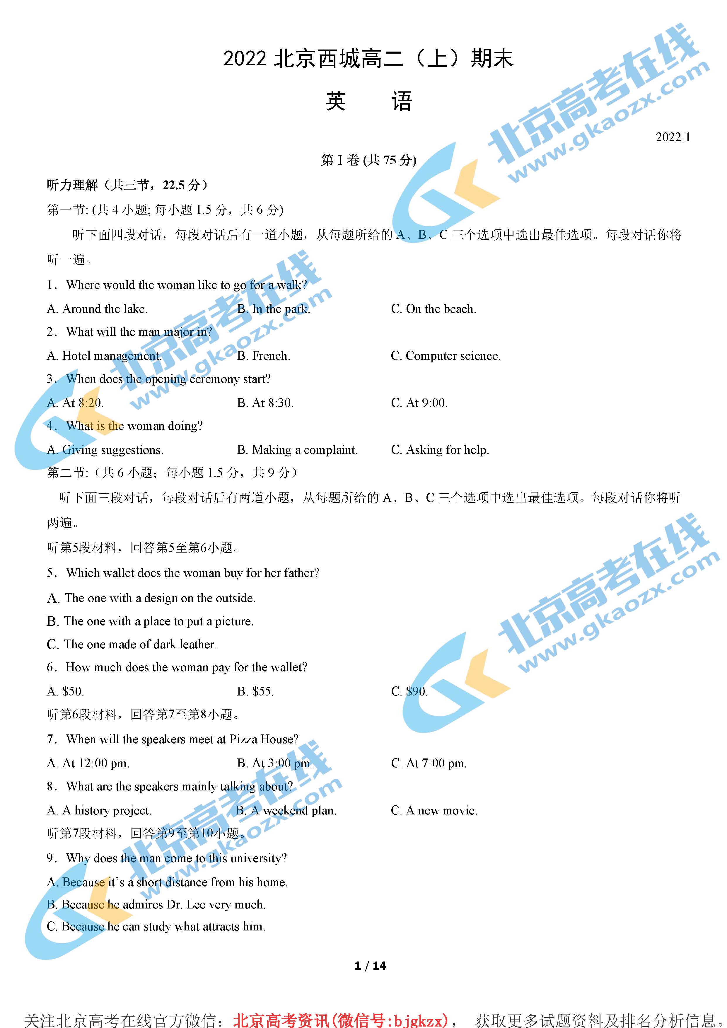 本文整理了北京西城区2022年高二上学期期末英语试题及答案,同学们一起来看看吧!北京西城区2022年高二上学期期末考试已于1月12日开考,目前各科已经考完,北京高考在线团队整理了北京西城区2022年高二上学期期末英语试题及答案,特意分享给同下载学习。