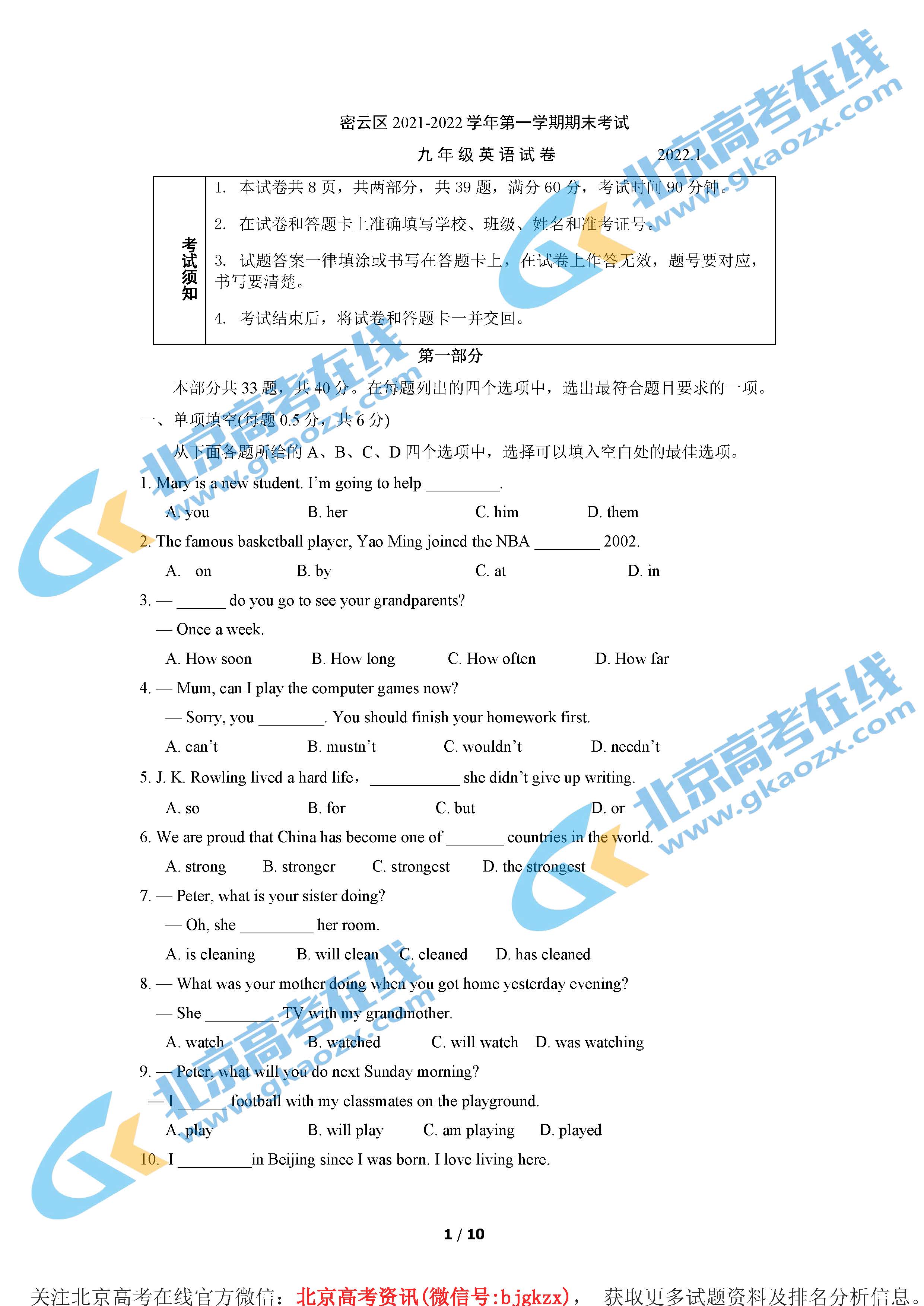 北京密云区2022年初三年级已在1月中旬进行了上学期的期末考试,为了方便大家查找相关试题及答案,北京高考在线团队整理了北京密云区2022年初三期末英语试题及答案,快来下载练习。