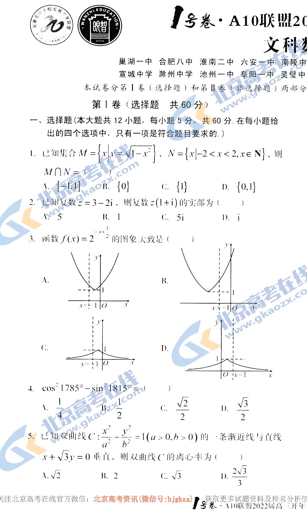 2月11日,2022年安徽A10高三开年考正式开始,各科试题及答案陆续公布。为方便大家练习,北京高考在线团队整理了文科数学试题及答案,大家可以下载。