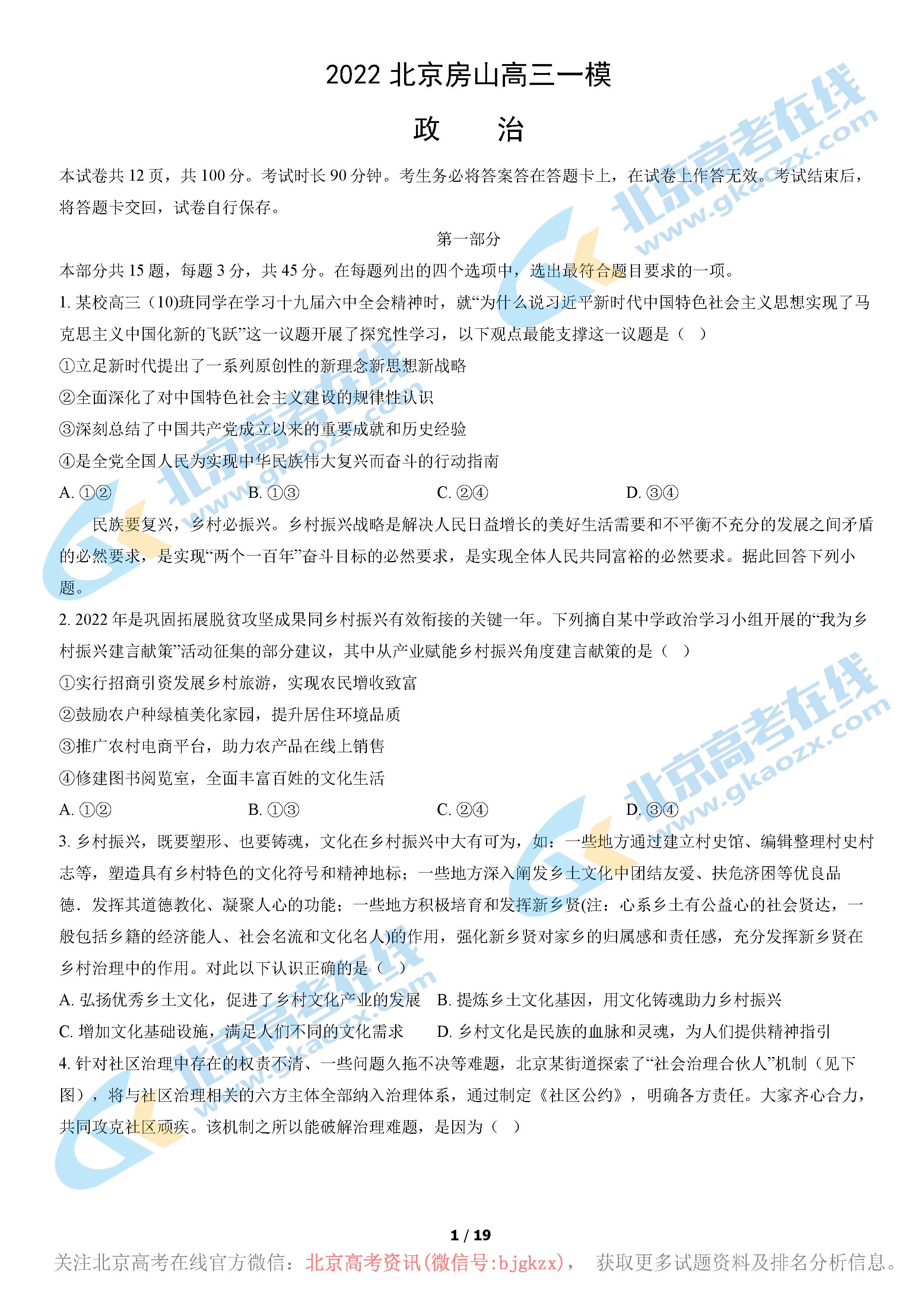 2022年北京房山区高三一模已开考,目前政治考试已结束,北京高考在线团队整理了政治试题及答案,分享给同学们。大家可以在线下载试题学习。