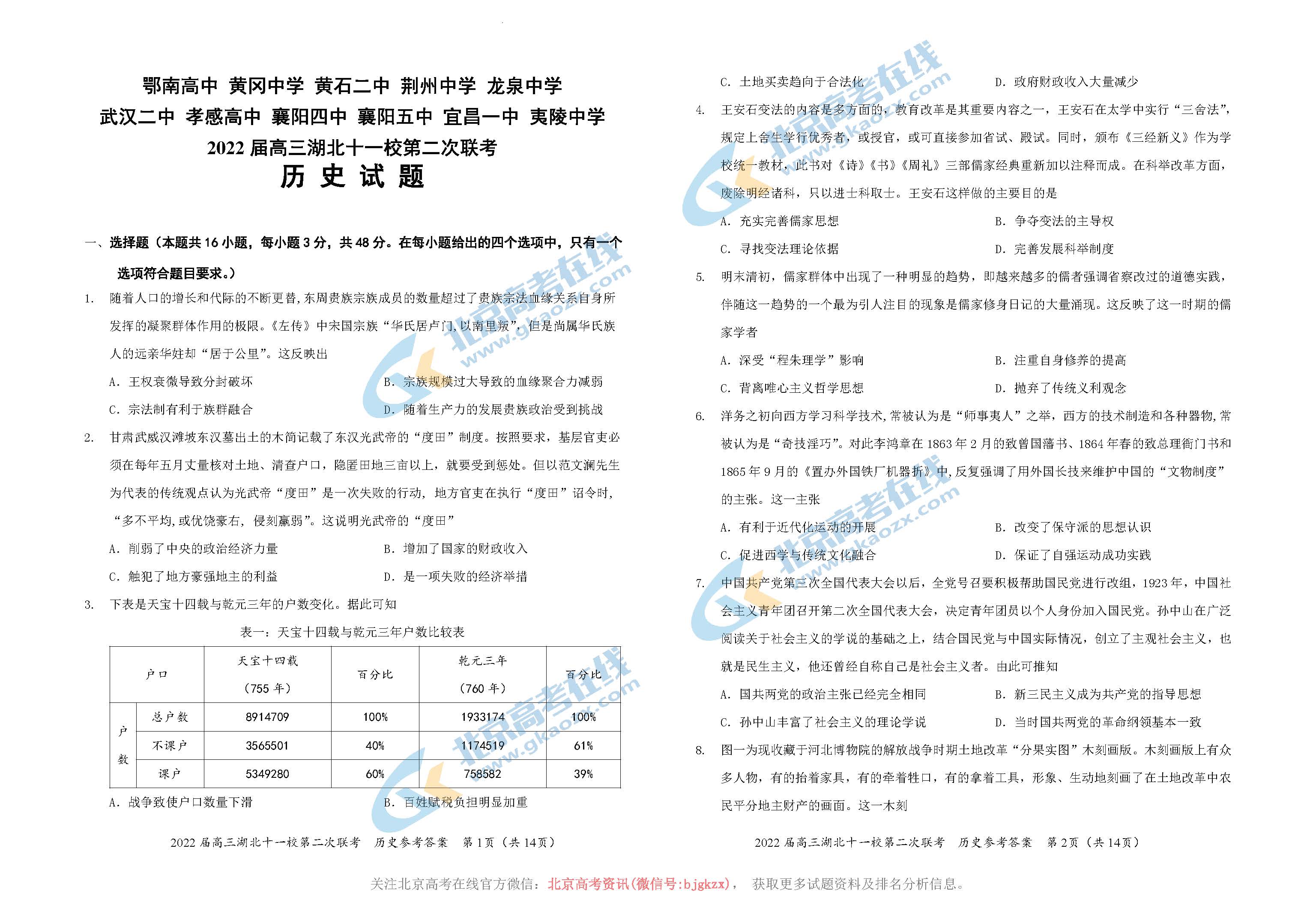 2022年湖北十一校高三二次联考历史试题及答案出炉,其他各科试题都可以下载了。想要练习湖北十一校高三二次联考试题的考生重点关注。3月30日,湖北十一校二次联考开考,目前历史考试已经结束。北京高考在线团队收集了此次湖北十一校二次联考历史科目试题及答案,想要练习的考生可以下载。