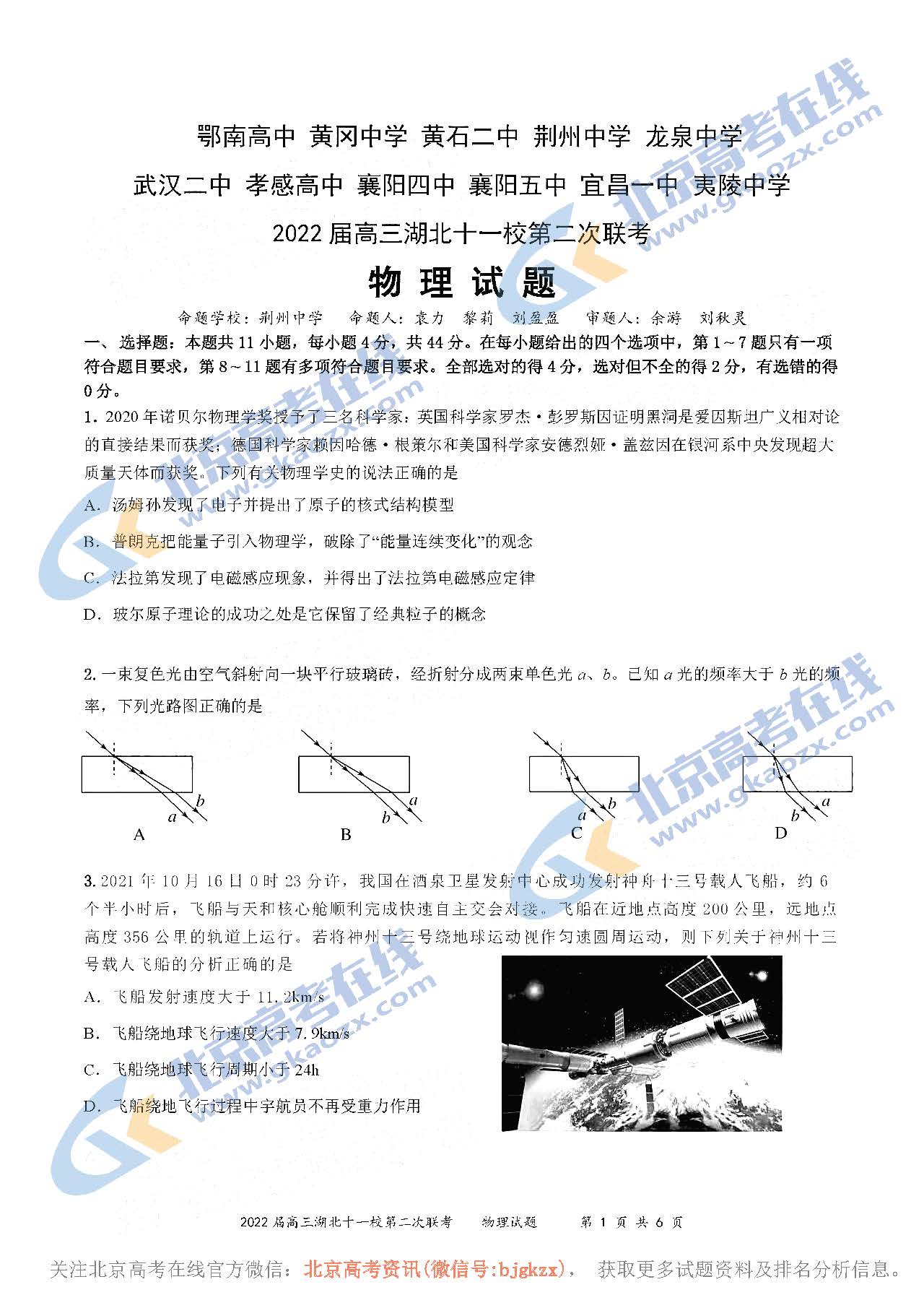 本文整理了2022年湖北十一校高三二次联考物理试题及答案,其他各科试题下载链接也有,想要练习十一校二次联考的考生重点关注。3月30日,湖北十一校二次联考开考,目前所有科目考试已经结束。北京高考在线团队收集了此次湖北十一校二次联考物理科目试题及答案,想要练习的考生可以下载。