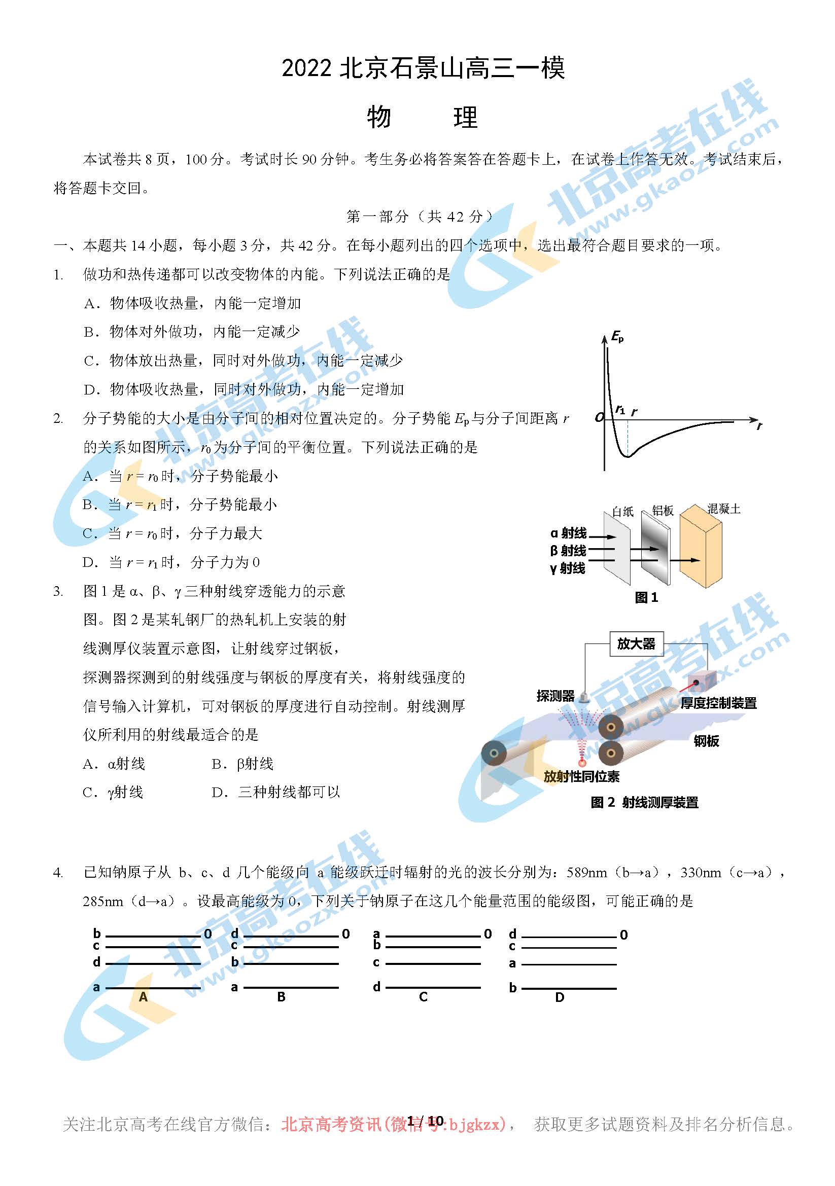 2022年北京石景山区高三一模于3月28日开考,目前物理科目考试已结束。为了方便大家查找相关试题及答案学习,北京高考在线团队整理了2022年北京石景山区高三一模物理试题及答案,分享给大家下载。